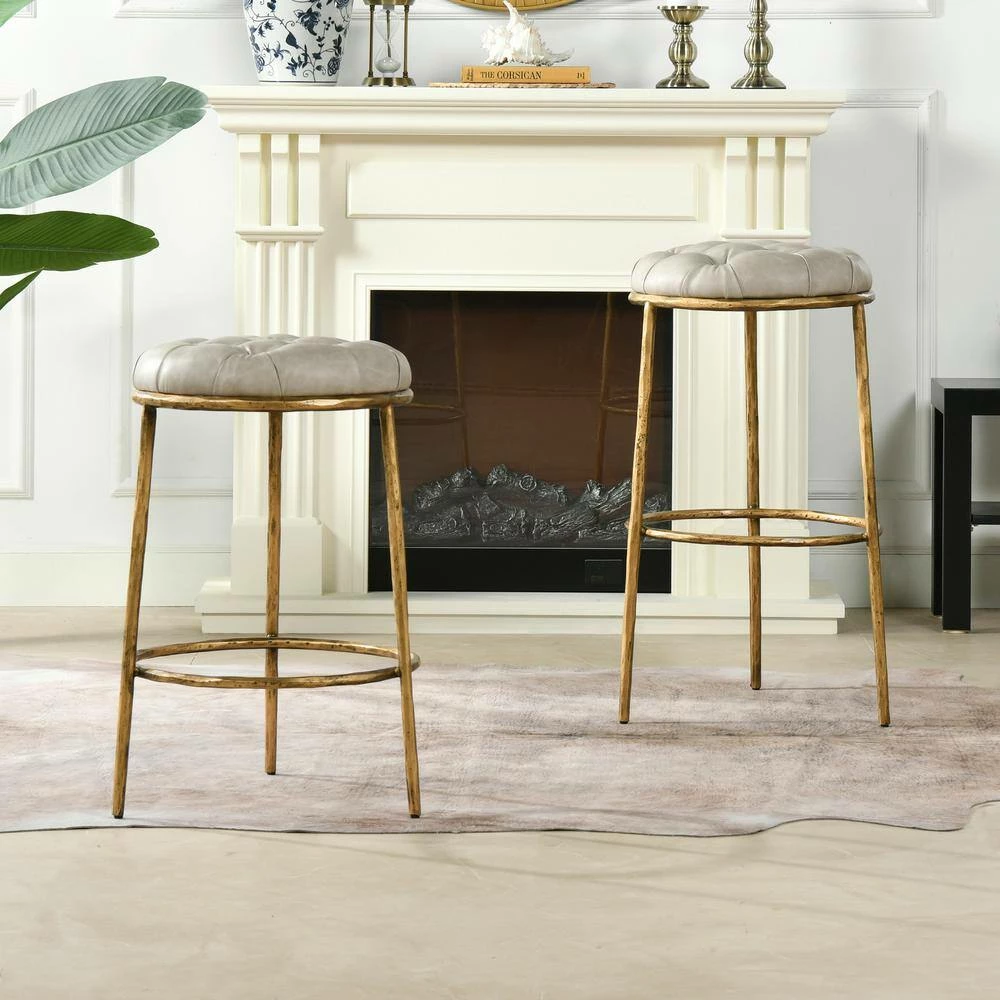 The Aerin Collection by Jennifer Taylor Home is defined by hammered brass metal in beautifully delicate silhouettes. This 3 legged bar stool features a round, backless silhouette with plush, button tufting on the seat. The footrest is the perfect height for, relaxing your feet while seating. Available in bar and counter heights.