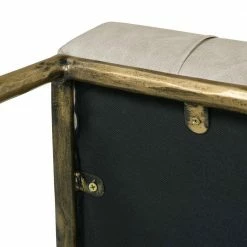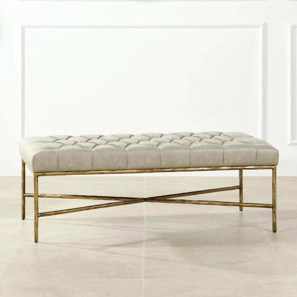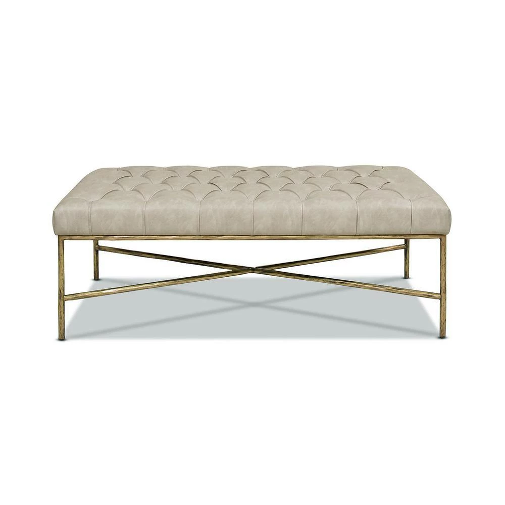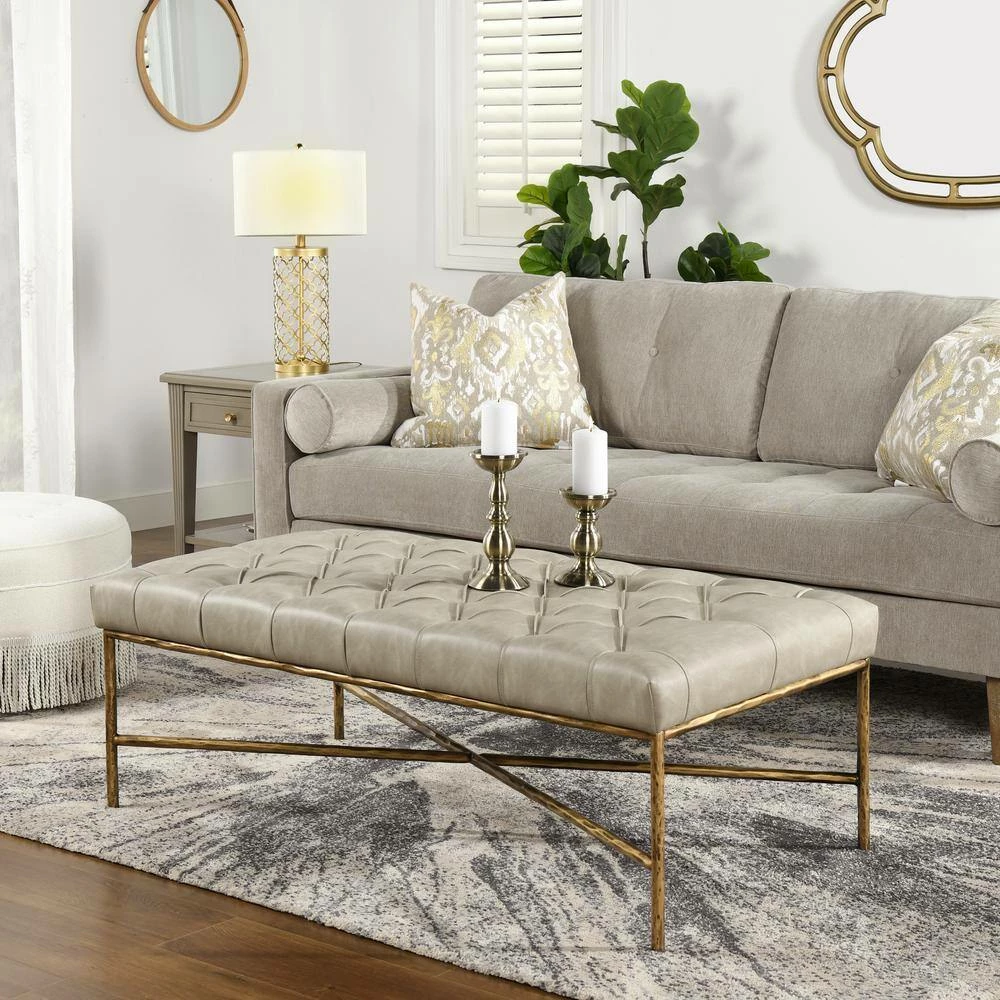 The Aerin Collection by Jennifer Taylor Home is defined by hammered brass metal in beautifully delicate silhouettes. This beautifully framed cocktail ottoman is generously sized to fit perfectly in front of a sofa or sectional. Upholstered in a contemporary gray faux leather, the top can display decor items on a tray or be a footrest while seated. Use this ottoman as a bench in a walk in closet or entryway for added versatility.