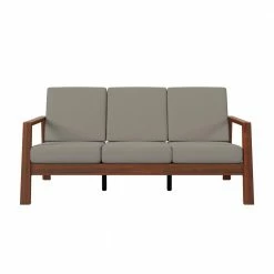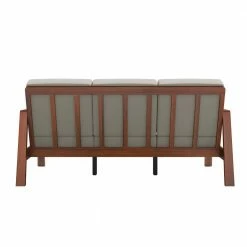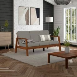 Inspired by the clean lines of mid-century modern design, our sofa features an exposed wood frame with a slatted back in a rich cherry finish. The comfortable box-seat cushions are covered in a durable, easy clean 100% polyester fabric. Ships in one (1) box. Takes less than 30 minutes to assemble with included tool, instructions and a Phillips screwdriver (not included). Imported, color may vary.