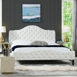 The Bridget Platform Bed Collection by Jennifer Taylor Home is a beautiful statement piece for any master suite or bedroom. The low profile headboard with camelback silhouette is tufted all-over and mirrored by the petite footboard. The platform style support slats do not require a box spring so your mattress can lay directly on the bed. Available in King and Queen sizes, and in multiple color and fabric options, the Bridget Platfrom Bed is perfect for Glam, Transitional, and Farmhouse styles