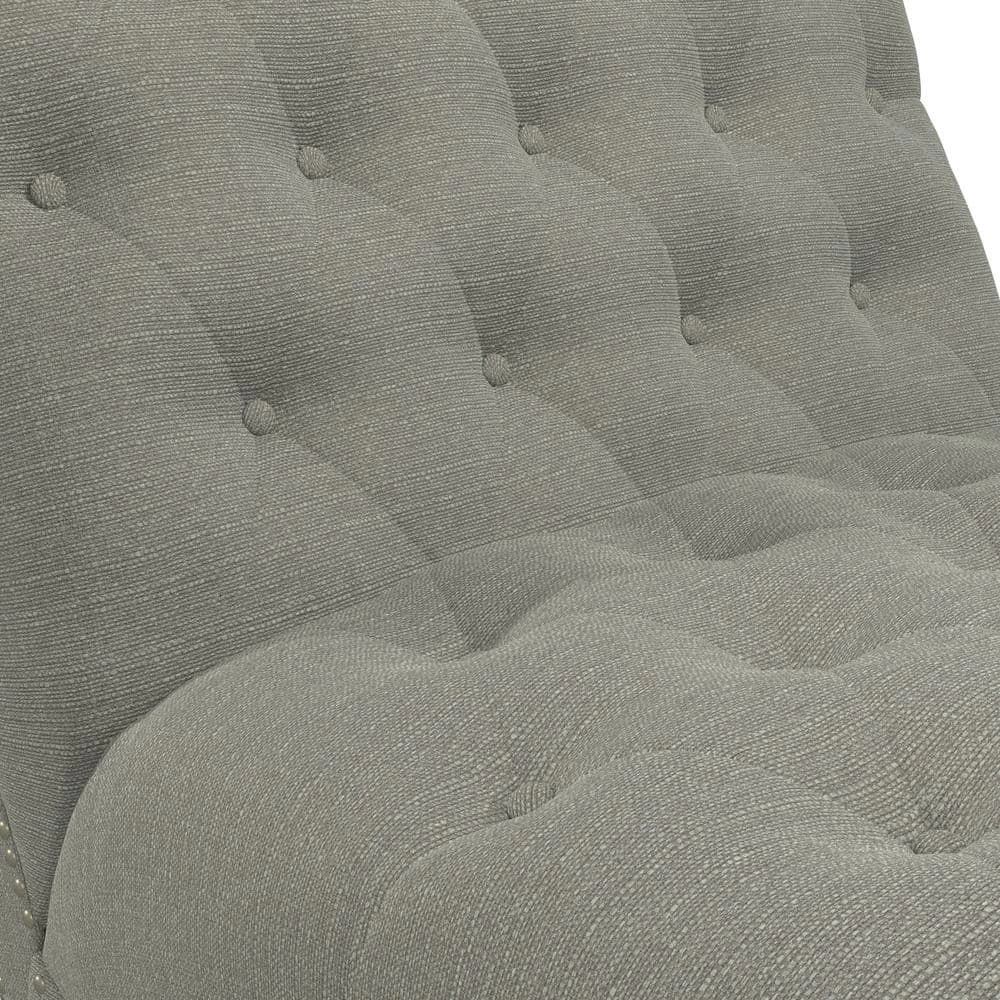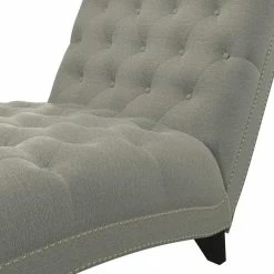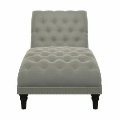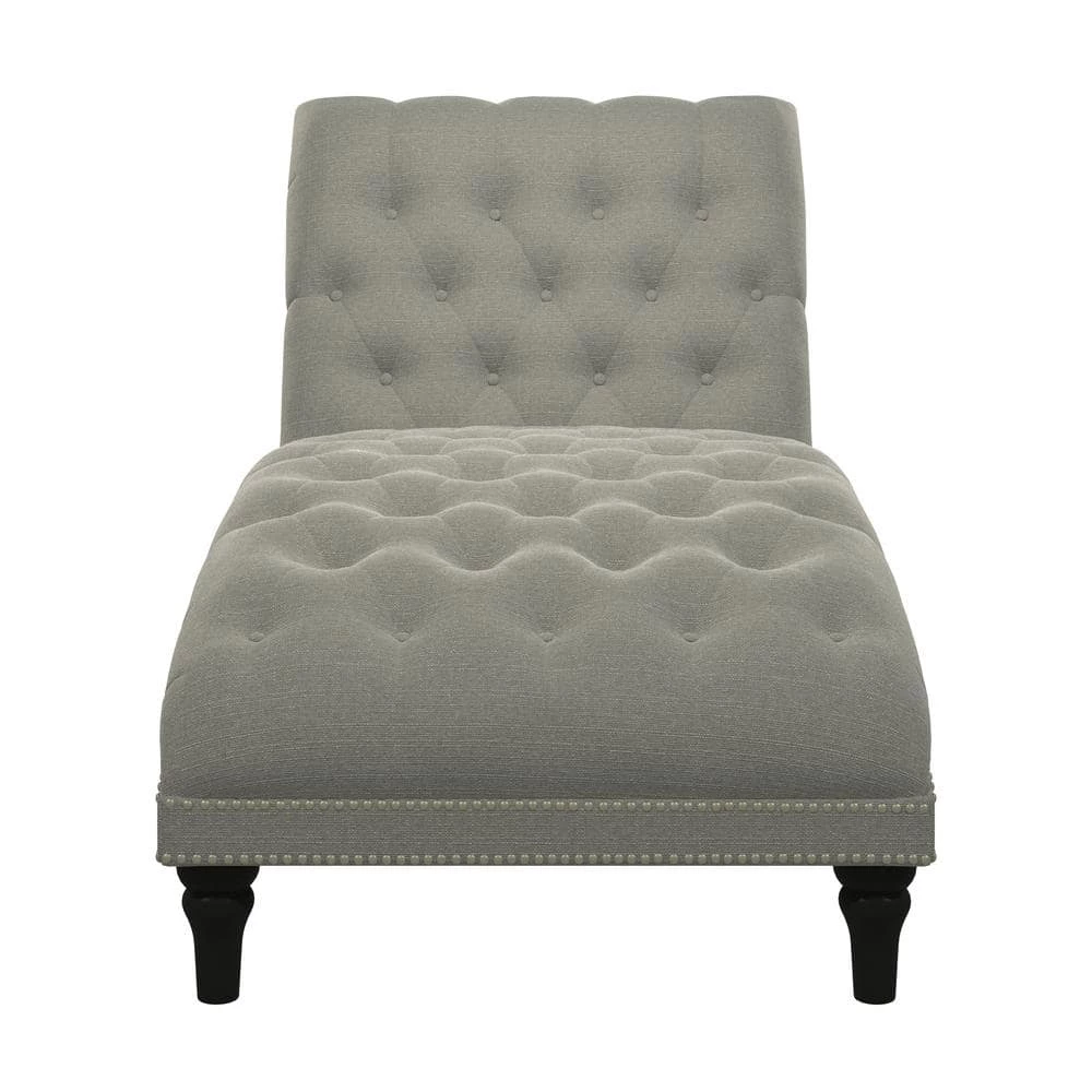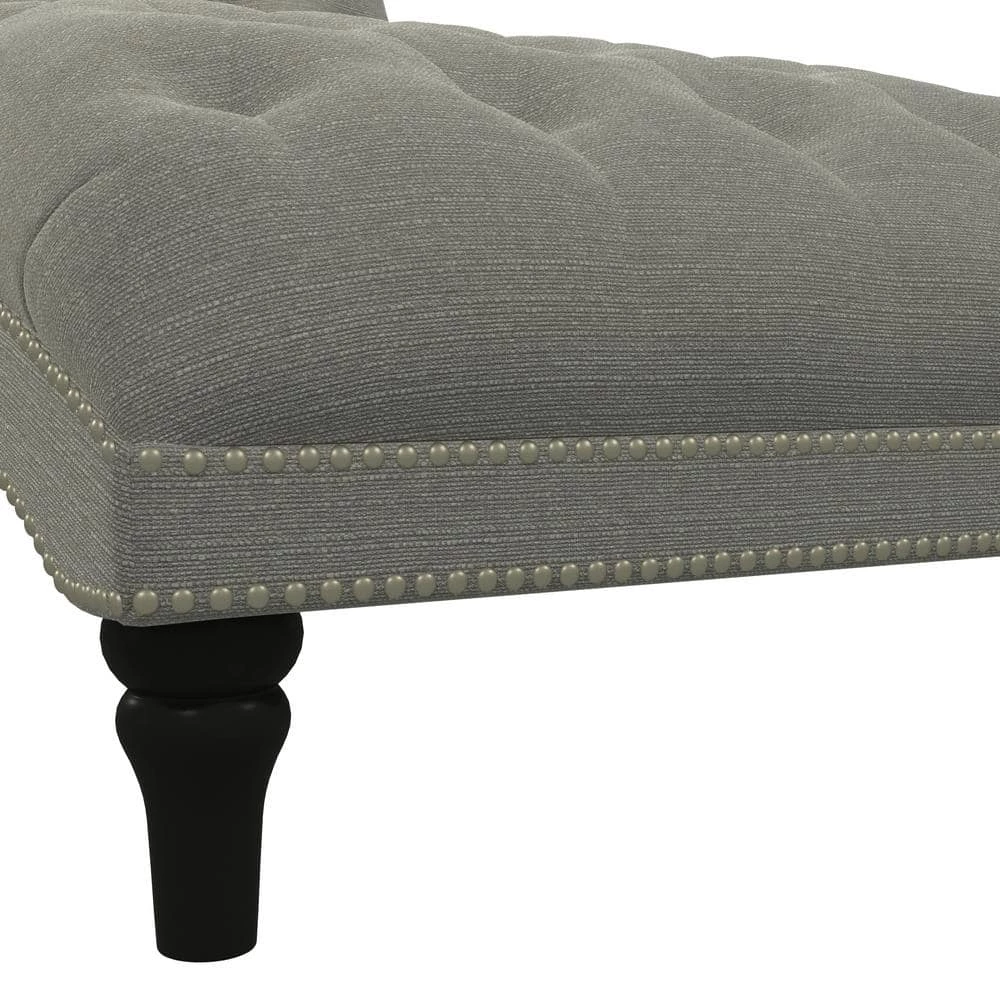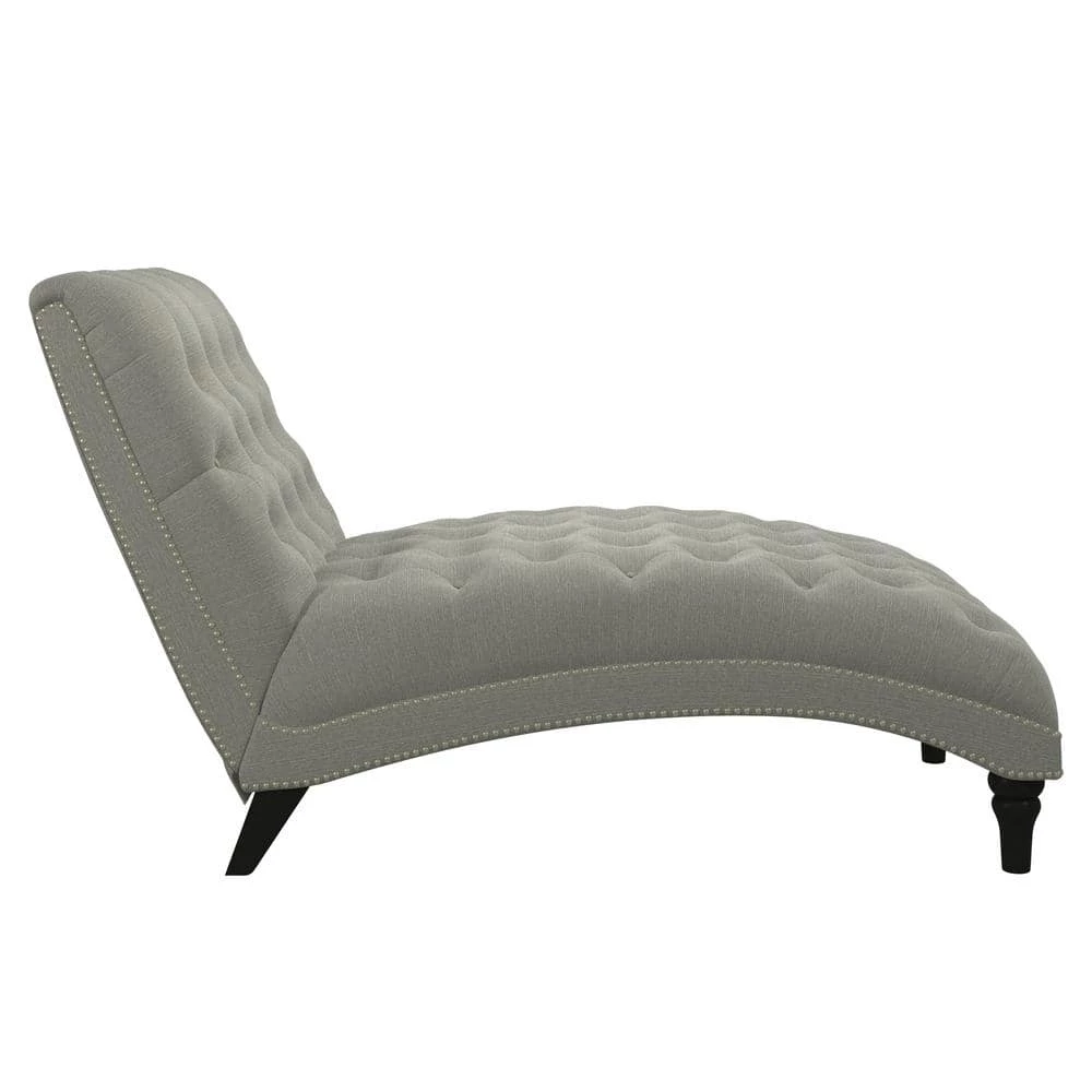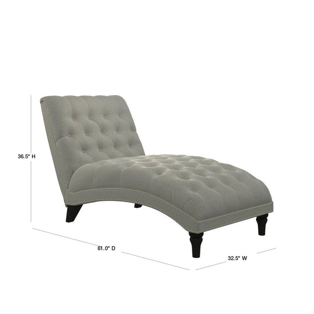 Upholstered chaise lounge features an inviting and elegant design with clean lines, a curved seat and arched back. It is accented with lace tufting on the seat and the back and is complimented with hand applied pewter nail head trim. The wider seating surface allows for snuggling up with your favorite person, pet or just enjoying the extra space for yourself to lounge, nap or relax in comfort. The fully upholstered chaise is filled with foam and fiber. Covered in a durable, easy clean 100% polyester linen-like fabric. Takes less than 45 minutes to assemble with included tool and instructions. Imported, color may vary.