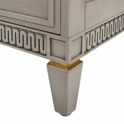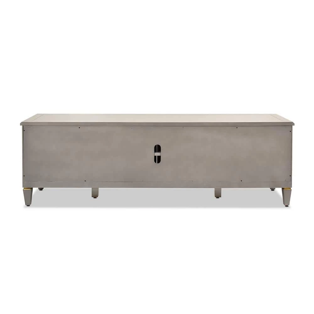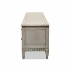 Elegant and understated, the Dauphin 71″ Entertainment Storage Console by JTH Luxe is a timeless classic casegood furnishing for today’s multi-functional living and entertainment space. The 71 inch length can easily display all of your collectors’ items and decor, or be the support for widescreen up to a recommended size of 65″. The beautiful veneer in a trendy Cashmere Grey is accented with satin gold hardware and hand-painted gold accents. This TV unit also features ample storage compartments for all your electronic devices with one wide shelving area and drawers on either side. The best part: assembly is not required – this unit arrives fully assembled. See the Dauphin Collection for the matching side and coffee tables, dining table and chairs, and more.