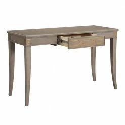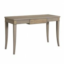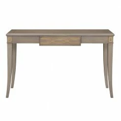 An elegant vanity solution, the Dauphin Console Table can be matched with a Dauphin Collection mirror and vanity stool to create the stage for your self-care routine. Or alone, this table is a beautiful accent piece for your entry or hallway. Crafted from solid birch wood and stained a classic gray, the beautiful wood grain peeks through and is complemented by the hand-painted accents in soft gold. Design details include a single drawer resting on metal slides. Due to the many variations in monitors and browsers, colors may appear different on different monitors. Since it is not possible to guarantee our online colors will look the same on all computers, we do not guarantee that what you see accurately portrays the color of the actual product. Due to the handmade nature of the product, the item received upon purchase may differ from the product displayed online.