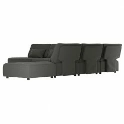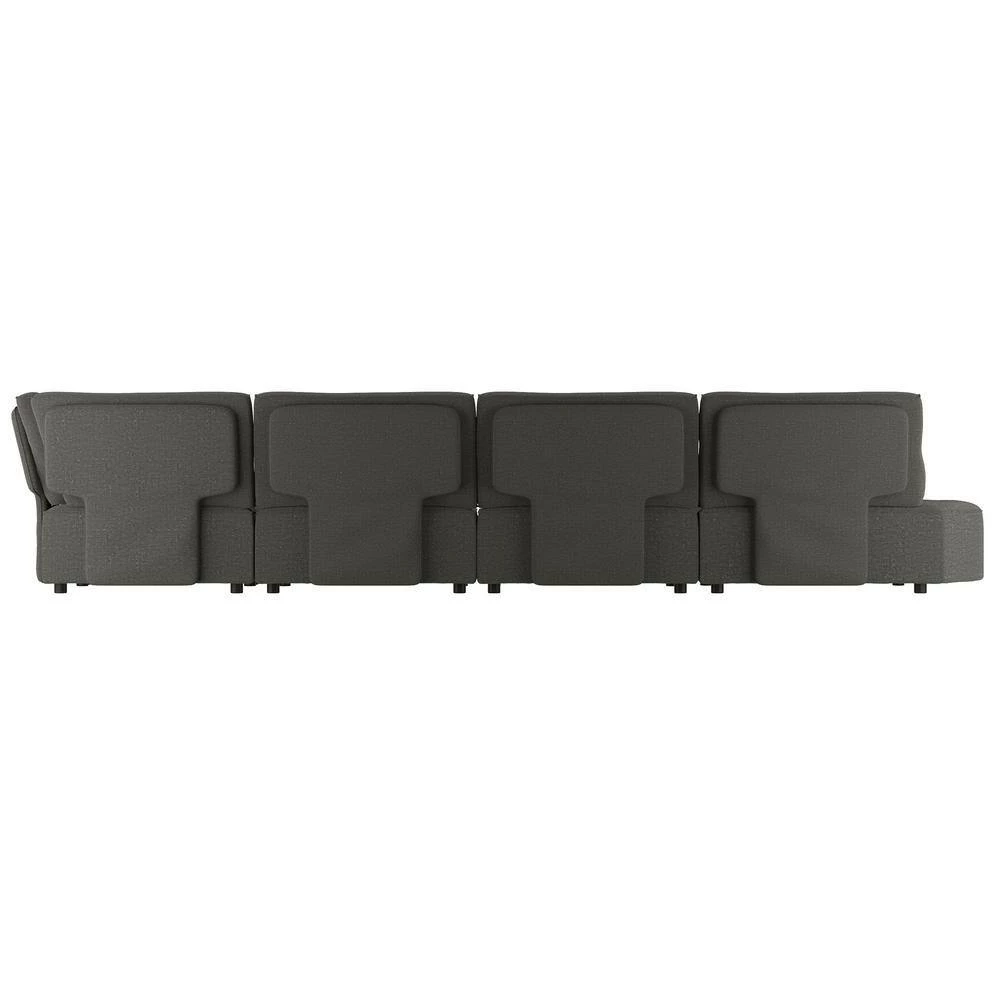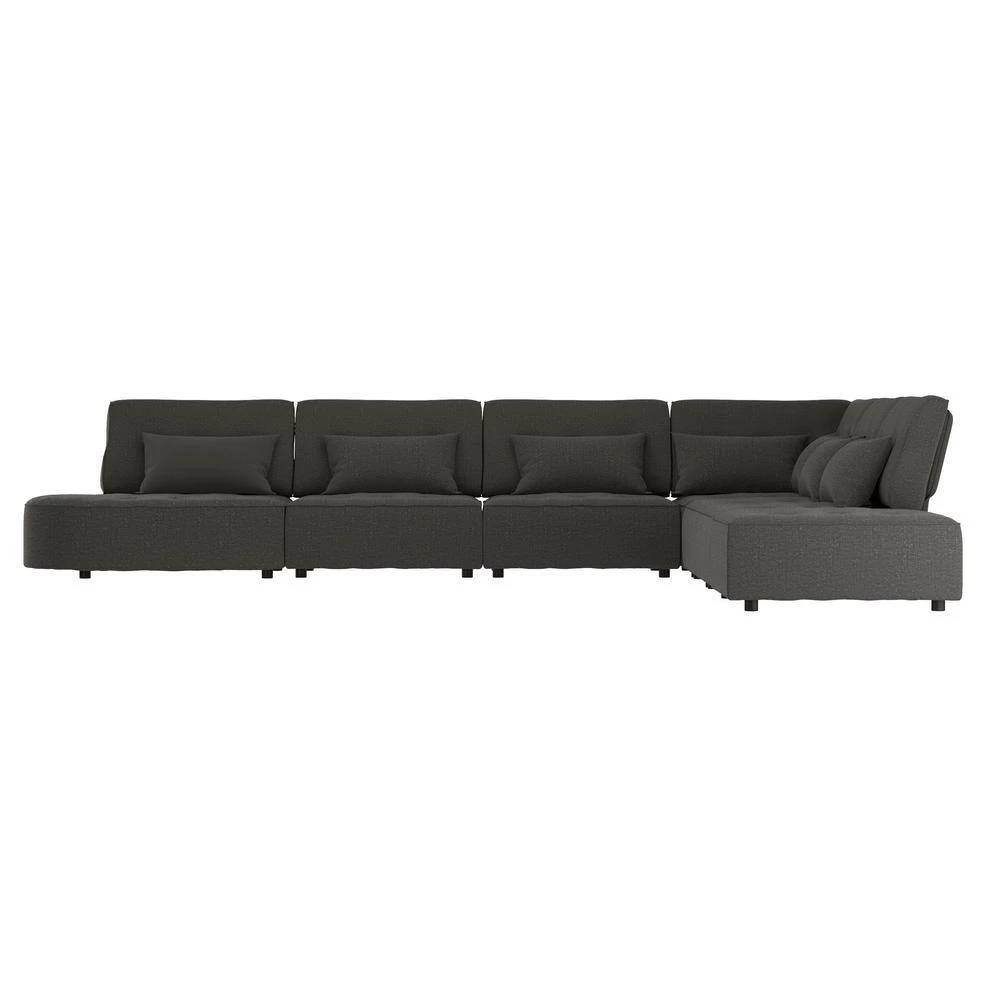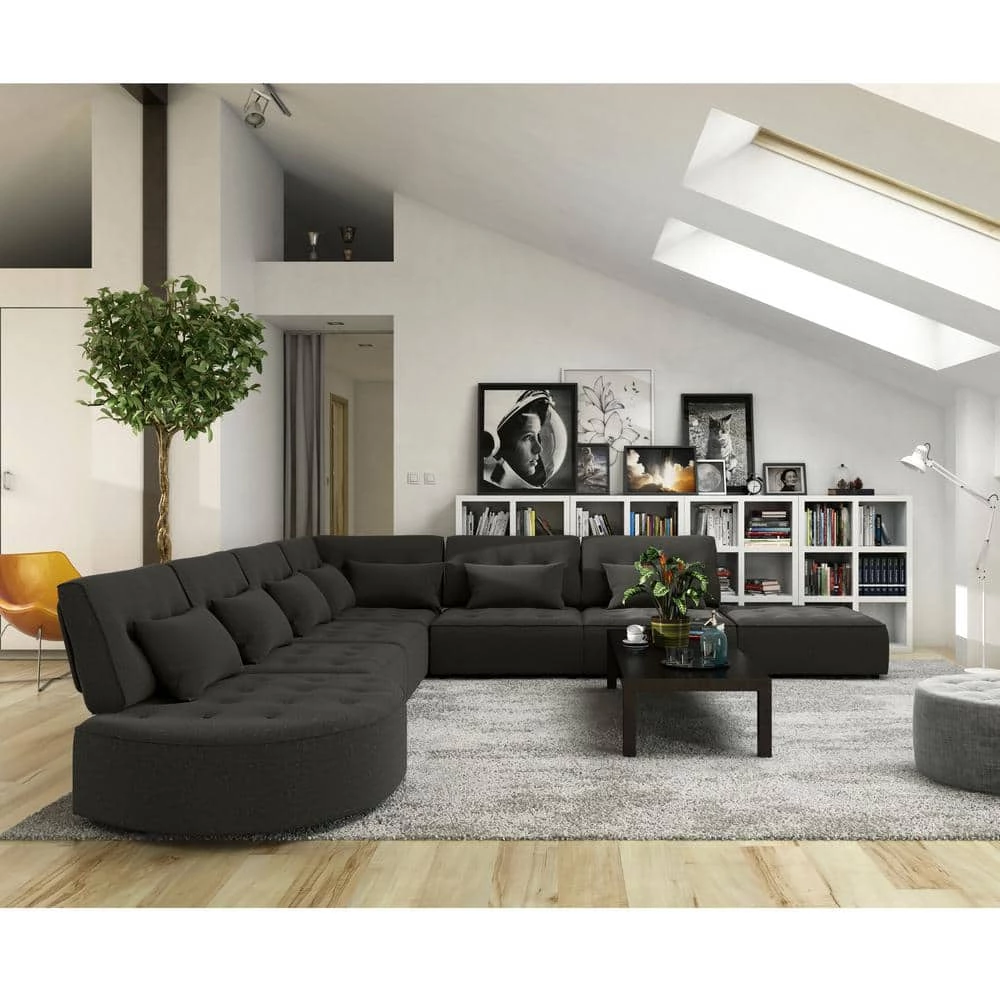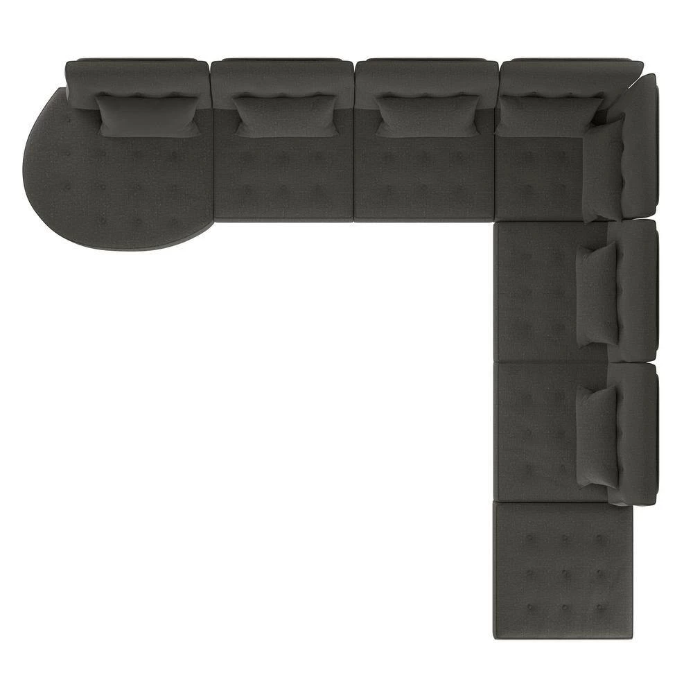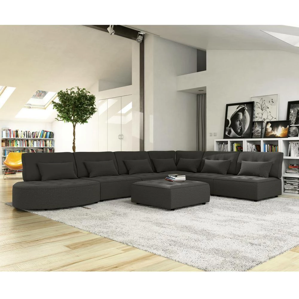 This modern modular sectional sofa has a unique designer look and boasts a combination of straight and curved lines to provide a custom look for your home. The sectional features a corner chair, 4 armless chairs, an ottoman that can be added to the end to create a chaise, plus a rounded armless end chair for a dramatic look. In addition, the sectional has tight seat cushions with button tufted detailing for comfort and style. The versatile modular pieces allow you the flexibility to configure your sectional while the clip connection on the legs will keep the pieces securely attached. Includes 7 accent pillows.