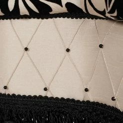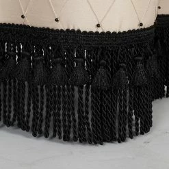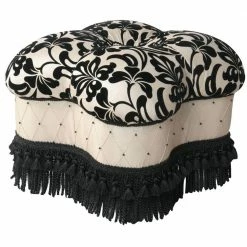 Glam meets traditional. The Ellen collection by Jennifer Taylor Home is the perfect balance of glam and traditional. Crafted beautifully with solid kiln dried Birchwood, upholstered with high-quality fabrics, and accented with a single hand tuft, decorative cords, and fringes along the bottom, this ottoman brings class and lounging comfort to any room in the home, whether its used as a footrest or additional seating for guests. Features:- The Birchwood is a deciduous hardwood that doesn’t molt or discolor over time which makes it ideal for furniture making. – All exposed hardware has a Zinc finish- Woven Polyester wrapped premium flame retardant foam for a medium firm feel- Masterfully designed by experienced furniture craftsmen and women- Shape: Clover- Main Fabric: Velvet- Color: Navy Blue, Black & Ivory- Some assembly required- Weight capacity: 200LBs- Made with fire retardant foam- Dry clean or spot clean only- Dimensions: 20″D x 18″H- Leg dimensions: 1″Lx1.5″Wx6″H- Weight: 12LBS