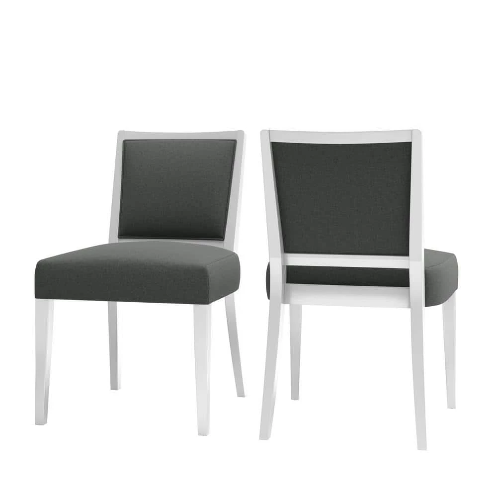 This set of 2 armless side chairs boasts an updated classic design that will elevate your home. The chairs feature a solid wood frame and legs with an upholstered seat and back cushion that provides the perfect amount of support for extraordinary comfort. Upholstered seat and back are covered in a durable, easy clean fabric that provides a comfortable seat. Imported, color may vary.