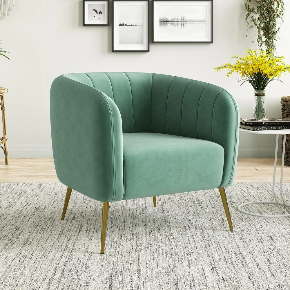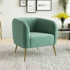 Lean back and lounge in this sumptuously styled barrel chair. This sophisticated chair features a rounded, channel-tufted back and arms and a deep, welcoming seat. Covered in a durable, easy clean 100% polyester fabric. Seats up to 300 lbs. Easy assembly, simply attach the legs. Imported, color may vary.