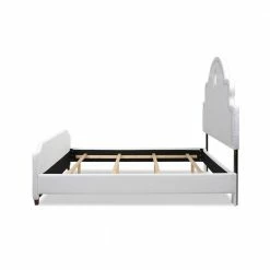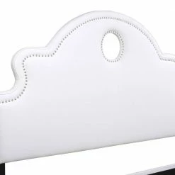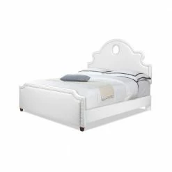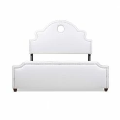 Take your bedroom styling to new heights with the Flora Keyhole Panel Bed by Jennifer Taylor Home. This extra tall headboard features a unique keyhole cutout that is accented by an elegant, curving headboard silhouette, while the end of the bed is finished with a simple, clean-lined footboard. Hand-applied nailheads on both add a glamorous touch. The overall effect makes for a beautiful statement piece in your master suite.