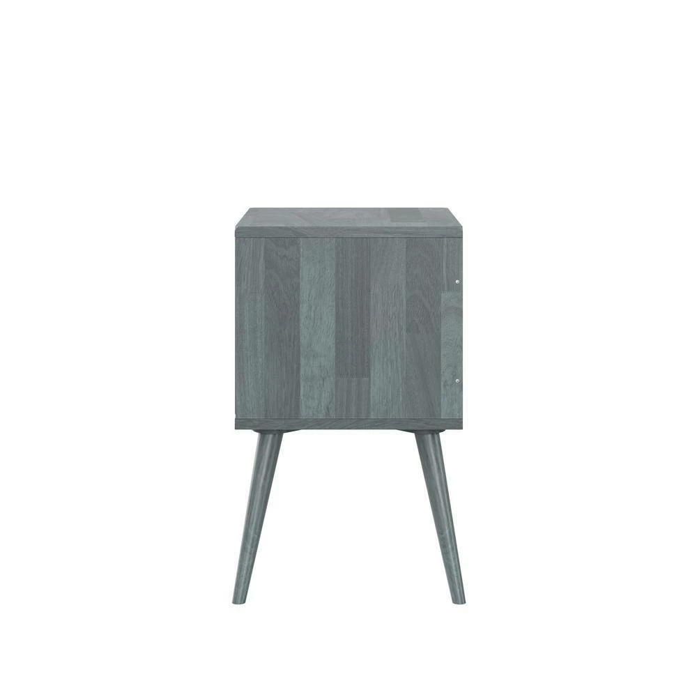 - Table features a single door with a cut-out circle handle and round flared legs