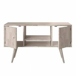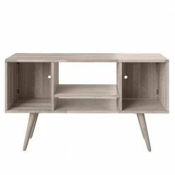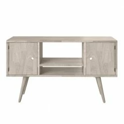 This mid-century modern entertainment cabinet is a multi-functional piece designed with style. The wood cabinet provides 2-open center shelves with 2-enclosed storage areas with doors and open backs for additional hidden storage. The round tapered legs flare out slightly to complete the look and provide support. Perfect for a record player, albums and a TV for the den, living room or basement. Easily assembled in less than 40 minutes with included tool and instructions, as well as Phillip’s screwdriver (not included). Ships in 1-carton. Imported, color may vary.