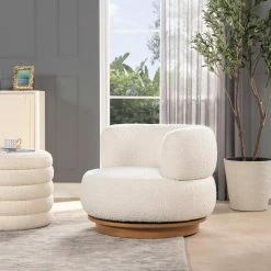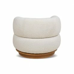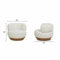 The Fuji Seating Collection by Jennifer Taylor Home features rounded silhouettes and plush boucle upholstery perfect for creating a retro-modern home. This low profile accent chair can swivel 360° and the recessed arms provide comfortable armrests. The rubberwood base in a natural light brown finish provides the perfect complement to this round design.