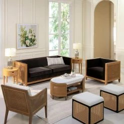 The Georgia Seating Collection by Jennifer Taylor Home brings California coastal vibes with a combination of a sleek Tuxedo silhouette with natural rattan and luxe velvet upholstery. The solid Oak wood frame features panels of cane rattan webbing on the sides and back so this living room collection can be showcased from any angle. The tight back balances the removable seat cushions. See the collection for the matching sofa and armchair.