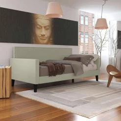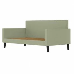 This beautiful contemporary daybed is the perfect platform to hold your standard twin size mattress. The daybed features a square upholstered back adorned with pewter nail head trim, square track arms and tapered wood legs in a black finish. Covered in a durable, easy clean 100% polyester soft to the touch fawn gray velvet-like fabric. Update your bedroom or spare room decor with this upholstered daybed with wood slats. To evenly distribute weight, 1 3/4-inch wide MDF slats run horizontally from side to side. The daybed is designed to make a great couch as well as a comfortable bed. Imported, color may vary.