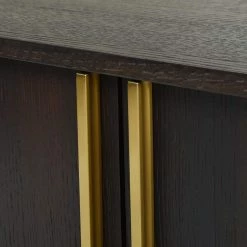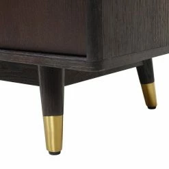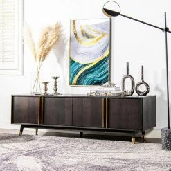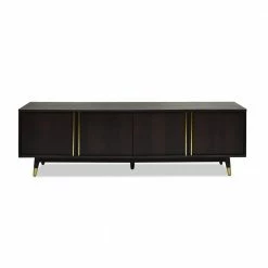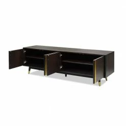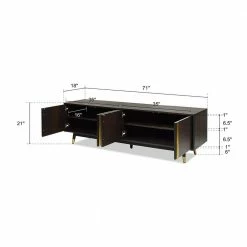 The Hausen Collection by JTH Luxe is a showcase of luxurious Mid-Century Modern design with hints of industrial glam. The Hausen entertainment center is well suited for a sophisticated home that desires a touch of gold. The handsome dark brown Oak wood and minimalist polished gold accents come together for a truly designer look. The 71 inch length accommodates TVs up to 75 inches diagonal. Four cabinet doors with push-magnetic closures open to reveal two large storage areas with adjustable shelves to keep electronics organized and hidden from view. The best part: no assembly required – arrives to your home fully assembled. See the Hausen Collection for the matching wall mirror.