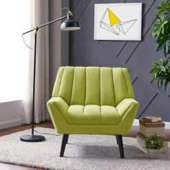 This arm chair boasts a mid-century modern design that will elevate your home. The chair features a square back with channel tufted design, sinuous springs and a thick foam cushion for extraordinary comfort. Covered in a durable easy clean 100% polyester plush low-pile velour fabric. Instructions and tool for assembly included. Takes less than 15 minutes to assemble. Imported, color may vary.