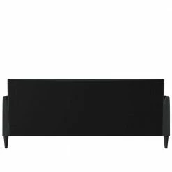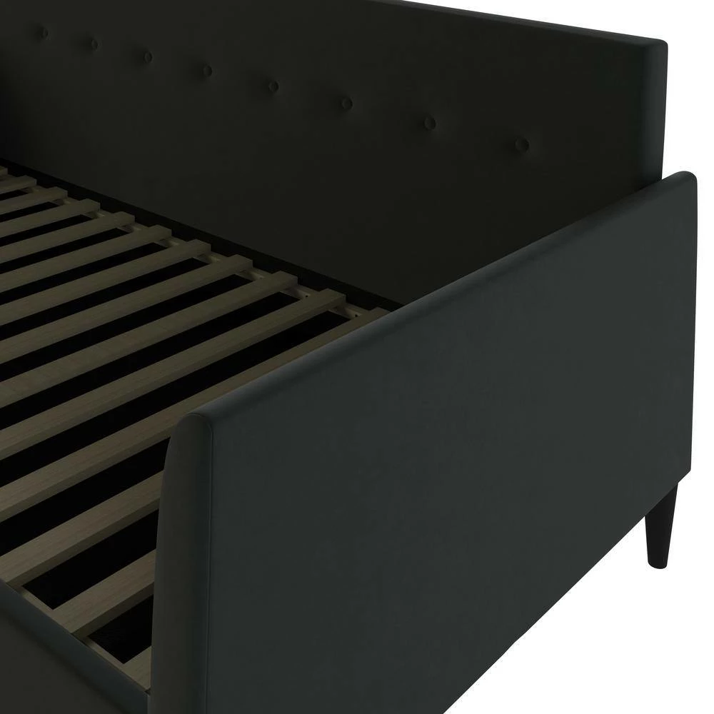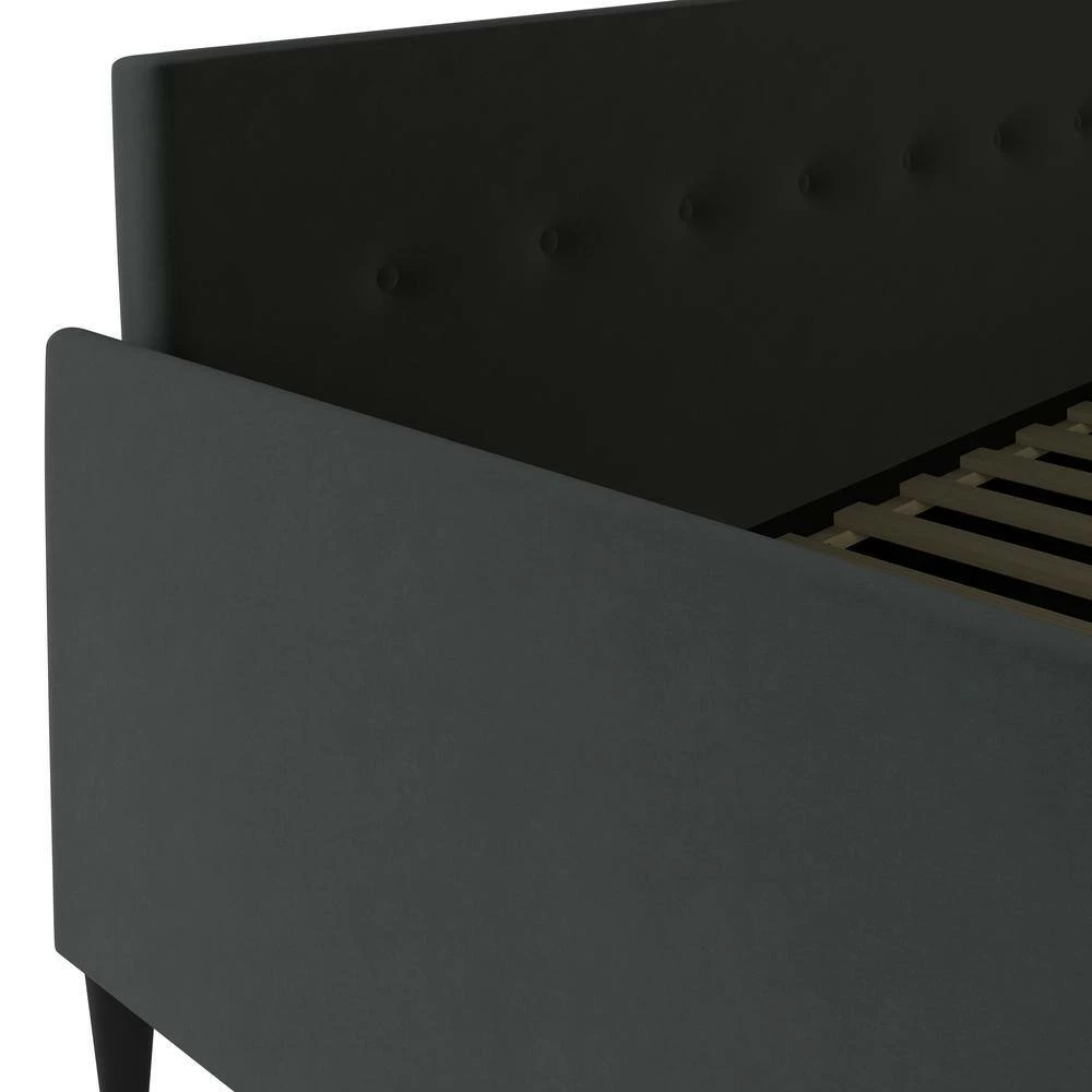 This beautiful mid-century modern style daybed is the perfect platform to hold your standard twin size mattress. The upholstered daybed features a square button tufted back, square track arms and tapered wood legs in a black finish. Update your bedroom or spare room decor with this upholstered daybed with wood slats. Covered in a durable, easy clean 100% polyester soft velvet charcoal gray fabric. To evenly distribute weight, 1 3/4- in. wide MDF slats run horizontally from side to side. The daybed is designed to make a great couch as well as a comfortable bed. Imported, color may vary.