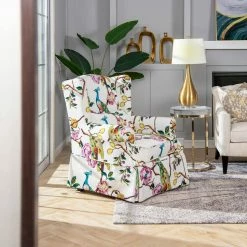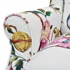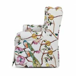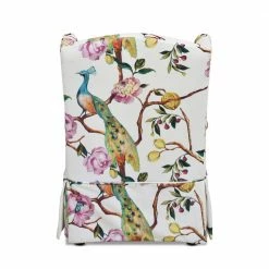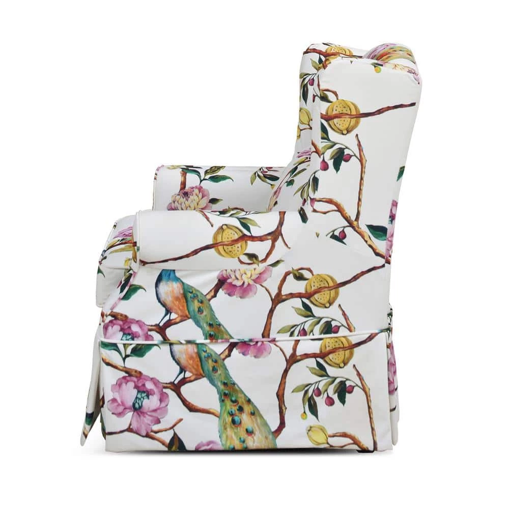- Slipcovered upholstery in a wrinkle and fade resistant peacock floral pattern polyester for durability and easy maintenance