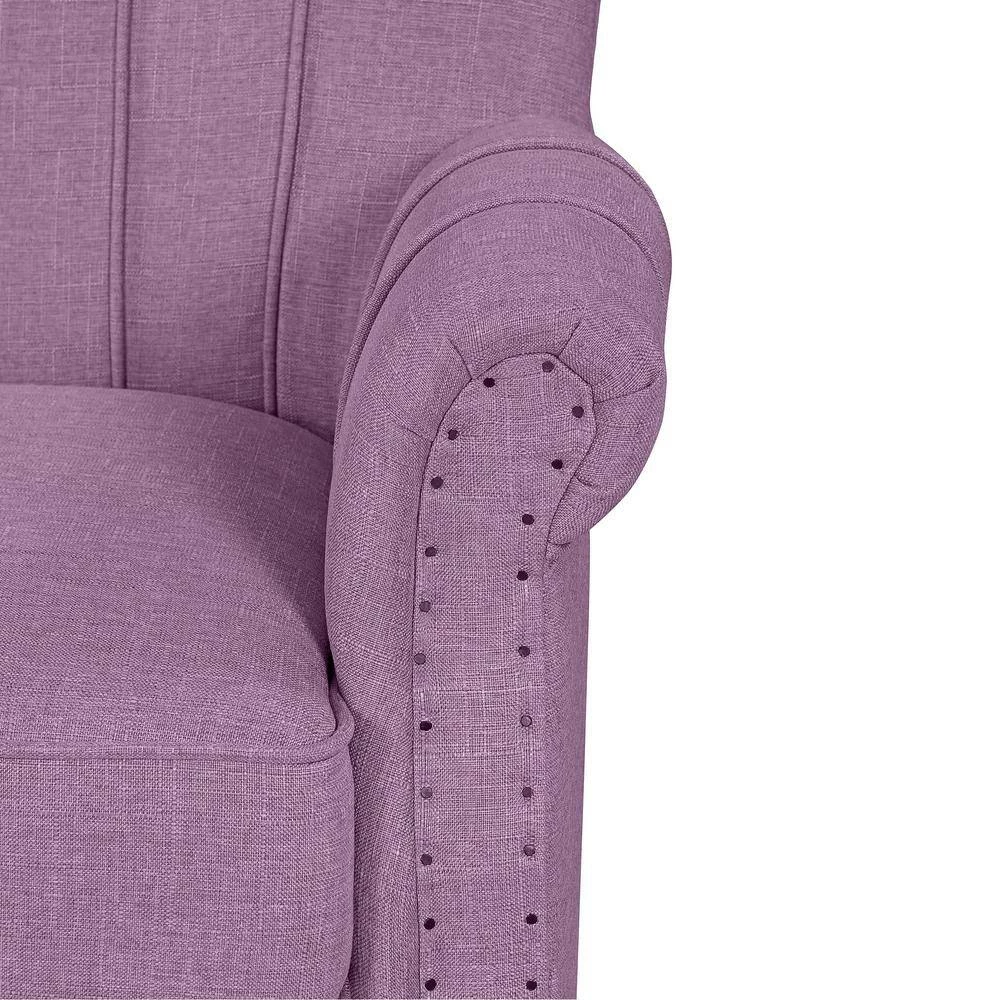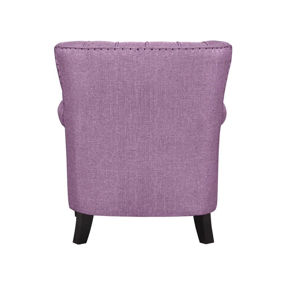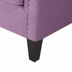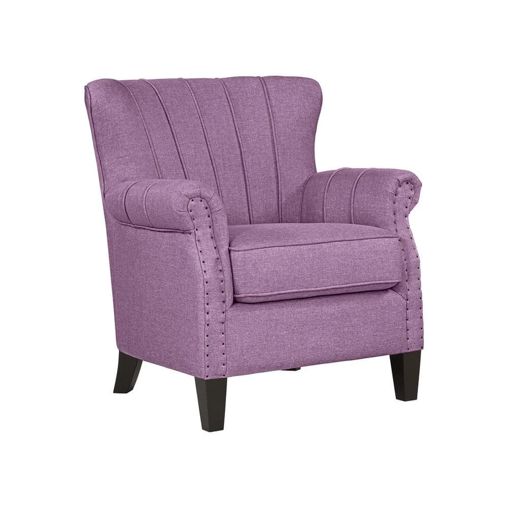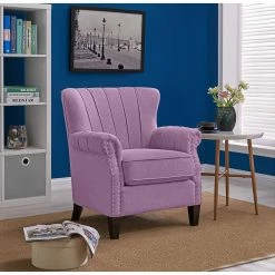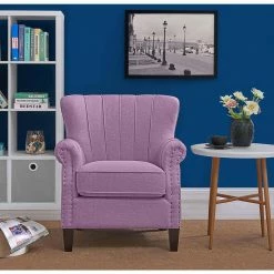 This arm chair boasts a classic rolled arm design adorned with hand-hammered exposed brads that reflect artisan tailoring that will compliment a variety of home styles. The chair features a squared channel tufted back design with a box seat cushion for extraordinary comfort and designer styling. Easy assembly, simply attach the legs. Imported, color may vary.