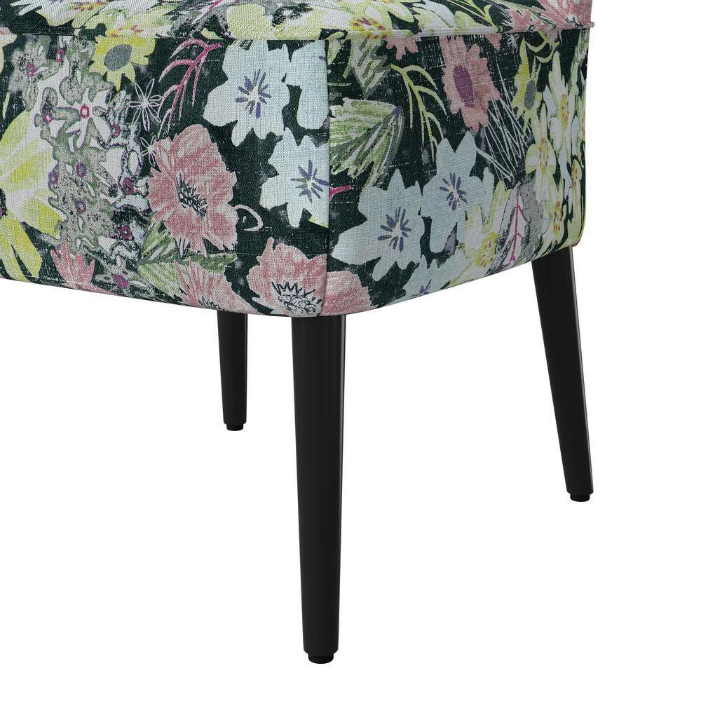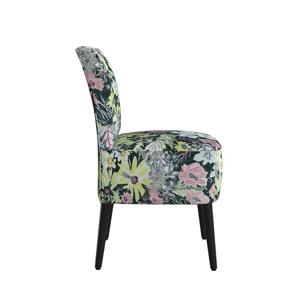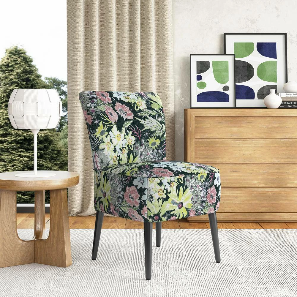 With its curved back and thick seat cushion, this is a chair that will stand out and be noticed. This armless chair is complemented with solid wood legs in a dark espresso finish for strength and style. Covered in a durable, easy clean, pet friendly 100% polyester linen-like fabric. Takes less than 15-minutes to assemble with included tool and instructions. Imported, color may vary.