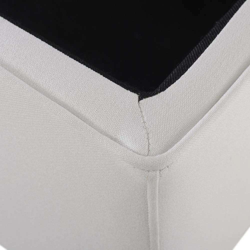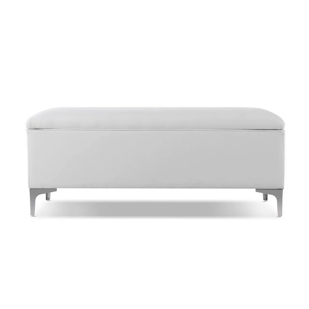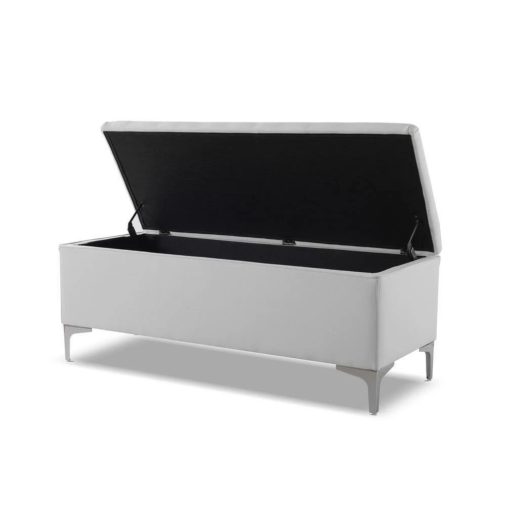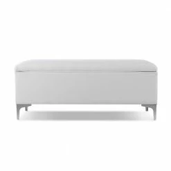 Modern and functional. The Madelyn Collection storage bench by Sandy Wilson Home offers a clean tailored look and constructed with premium quality materials. The hinged lid opens to reveal ample storage space for your winter comforter, pillows, or anything else you may want put away. This storage bench can withstand daily and frequent use thanks to its sturdy frame made from solid birch and 11-layer plywood upholstered in premium durable fabric and high quality foam padding. Holding everything up are 4 ultra strong iron legs finished in Polished Zinc with glides to protect your flooring. Versatile enough to be placed in the bedroom, entryway, or hallway, the Madelyn storage bench is one you will want in every room.