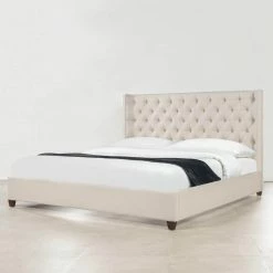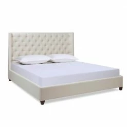 The Manhattan Bed Collection is a chic platform style bed frame with a tall, statement tufted headboard that is perfect for any master suite or bedroom. The headboard is tall and accommodates any thickness of mattress while the curved, wingback design brings a modern touch. The headboard, side and foot rails, and center support slats are included so no box spring is required.