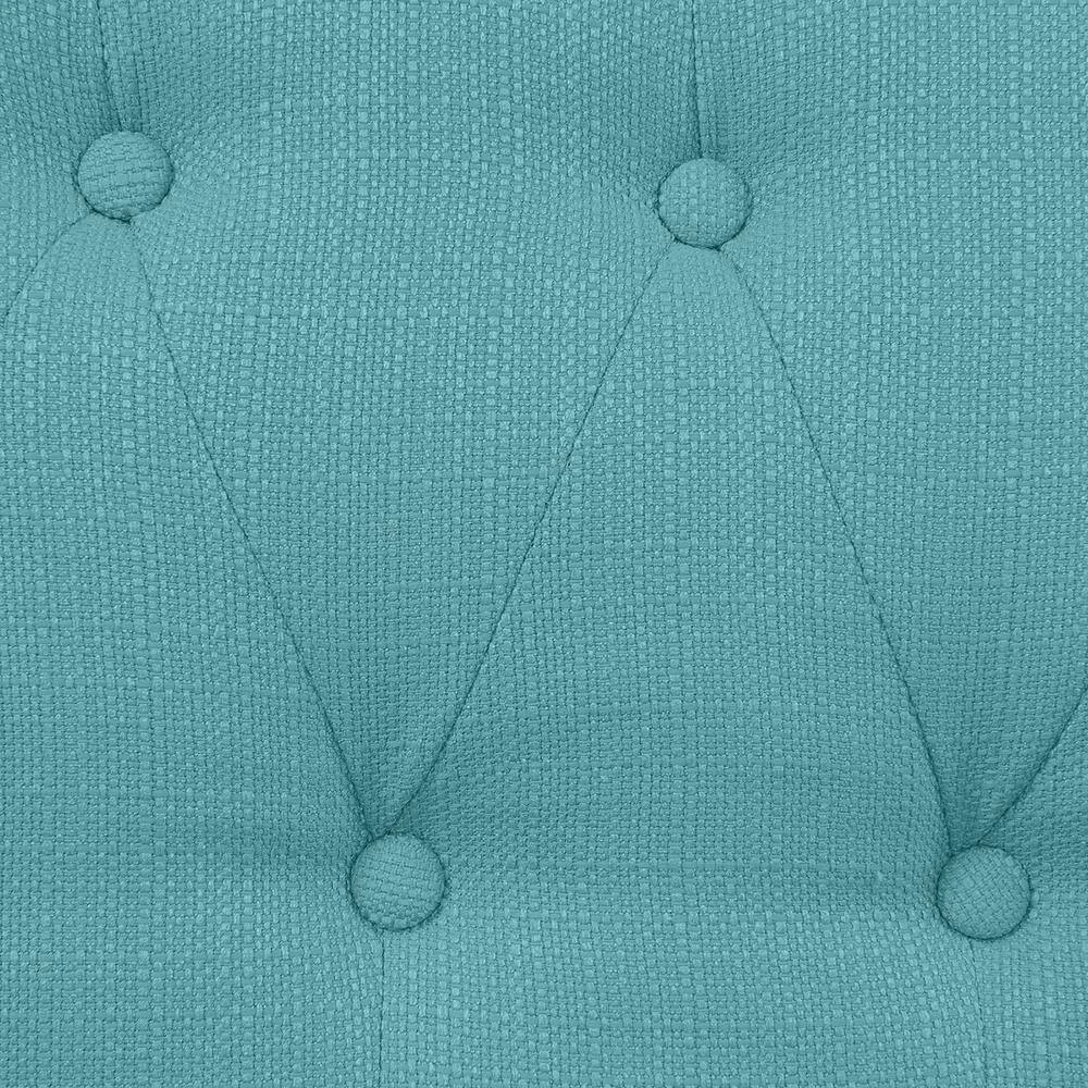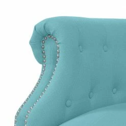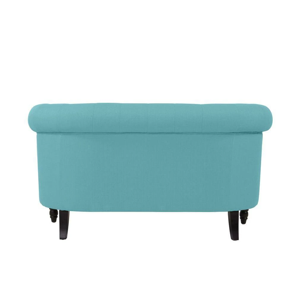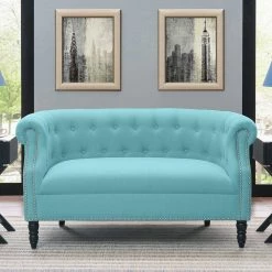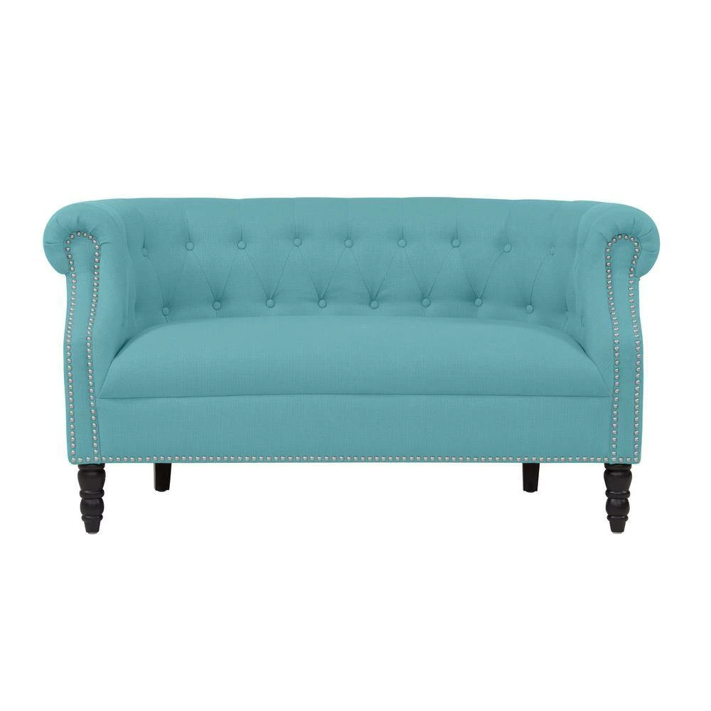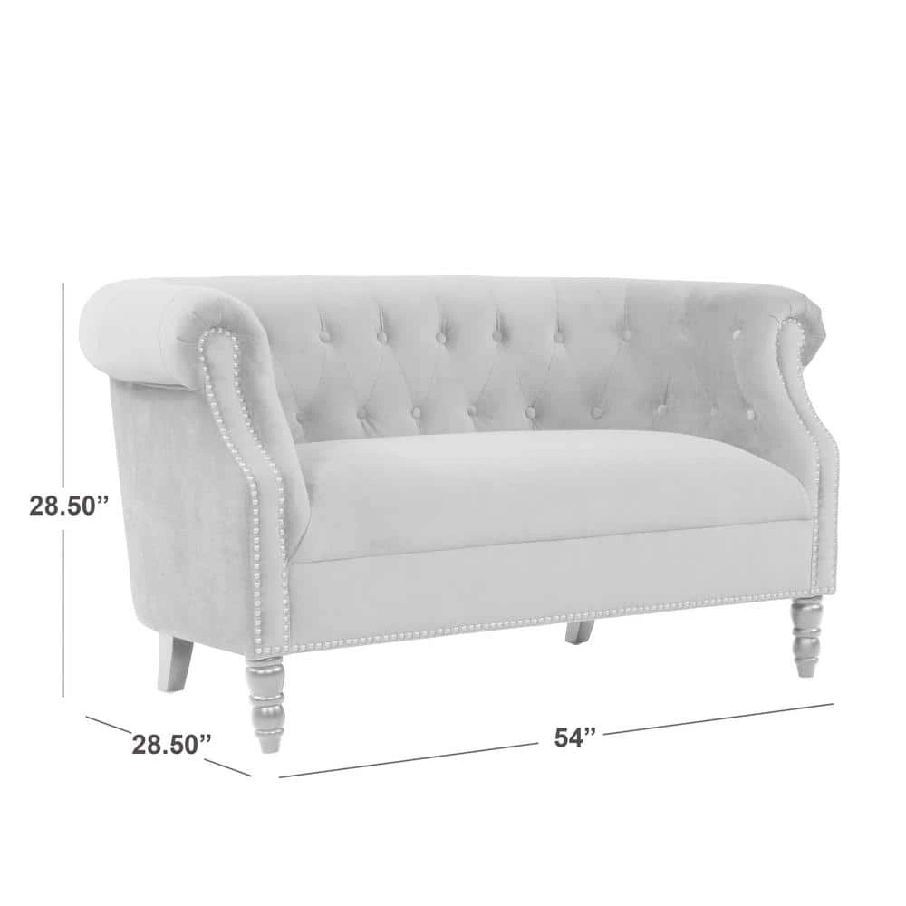 This transitional loveseat features a Chesterfield design with a button tufted back accented with rolled arms and hand tacked pewter nail head trim. The rolled arms flow seamlessly throughout the back. Ships in one (1) box. Fully assembled, simply attach the legs. Imported, color may vary.