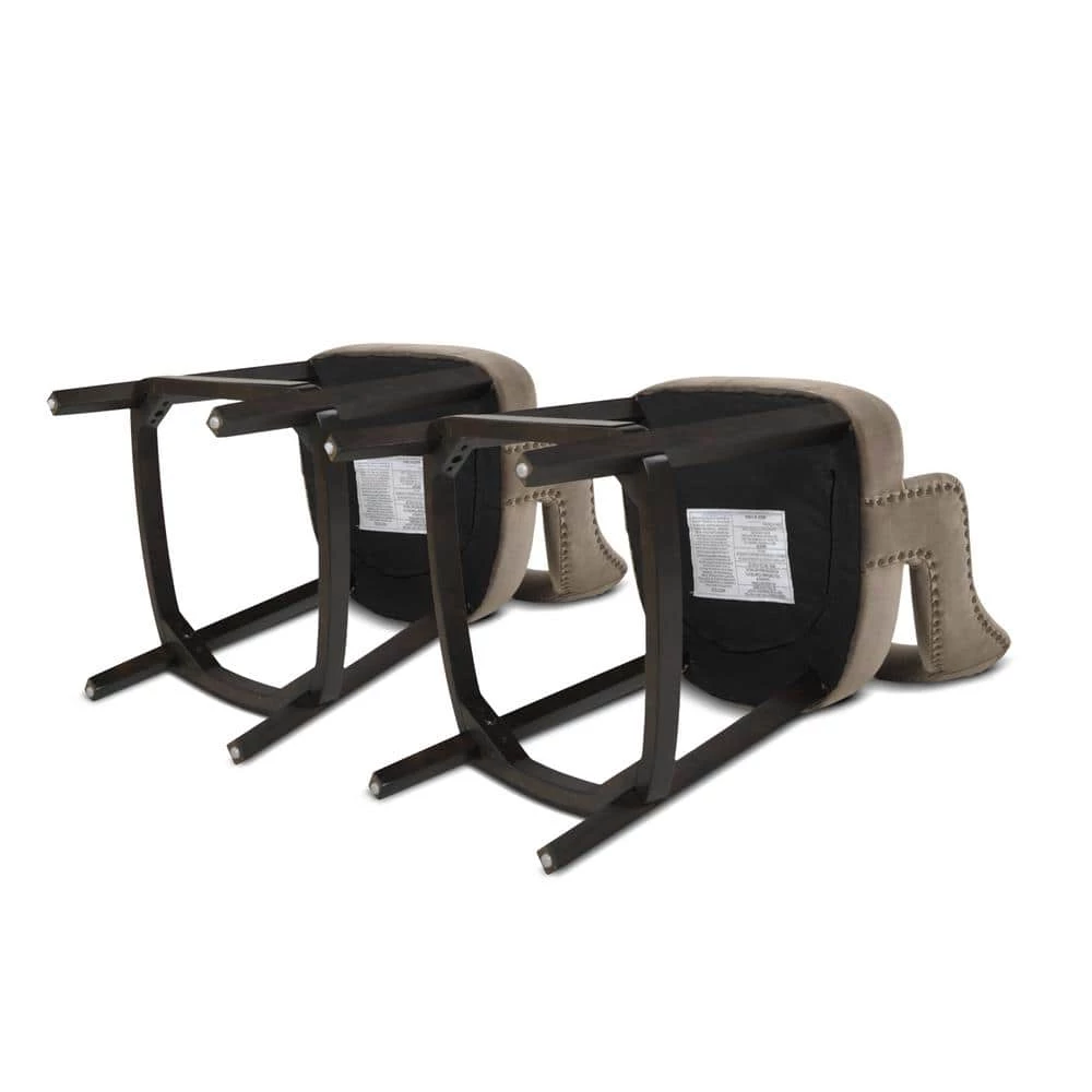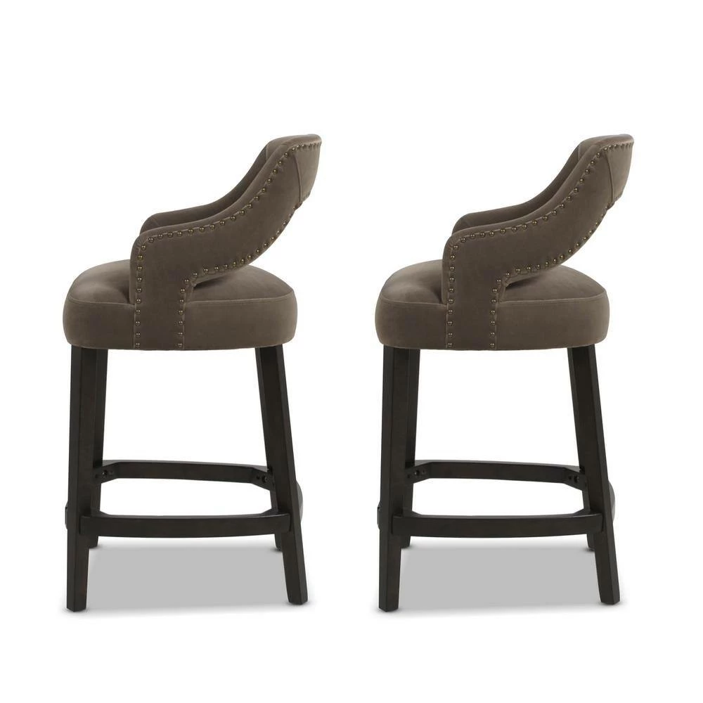 Elegantly modern, the Moderne Upholstered Bar Stool Collection features plush, comfortable seating that doesnt skimp on style. Fully upholstered with luxurious velvet atop a medium-firm foam seat, these 26 high bar stools work great with kitchen counters, high tables, or anywhere you need seating with a little extra height. Attractive nailhead accents line the arms and back of this stool, and a brass kickplate helps prevent scuffs and scratches to the dark espresso legs. Every purchase includes 2 bar stools for the perfect pairing for your home. Due to the many variations in monitors and browsers, colors may appear different on different monitors. Since it is not possible to guarantee our online colors will look the same on all computers, we do not guarantee that what you see accurately portrays the color of the actual product. If it is important that the sample be exact, we highly recommended that you order a swatch sample first, before placing the order.