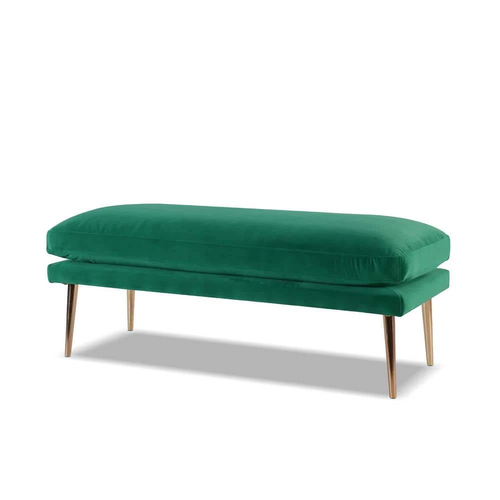 Glamorous and stylish are what best describe the Oliver Entryway Bench Collection by Sandy Wilson Home. You would think the dazzling looks of this modern mid-century style bench with its polished gold legs and plush down pillow top cushion belong in the lobby of a posh hotel or spawhy not bring that look home to your own living room for yourself to enjoy and impress your guests. Handmade with rich luxurious fabrics and a solid wood frame for exceptional quality that will last.