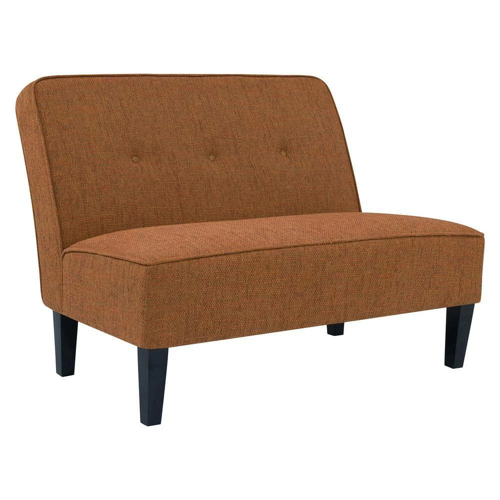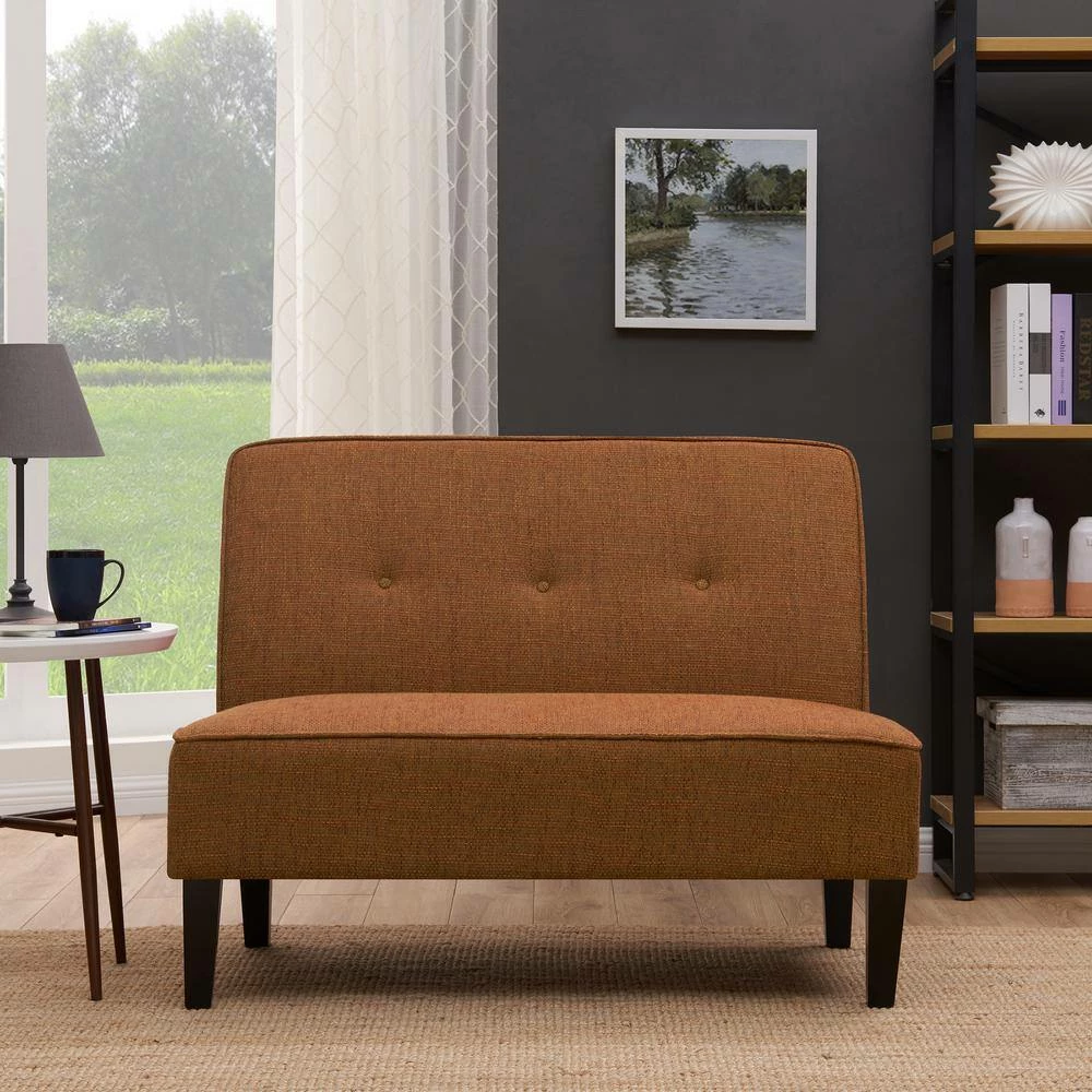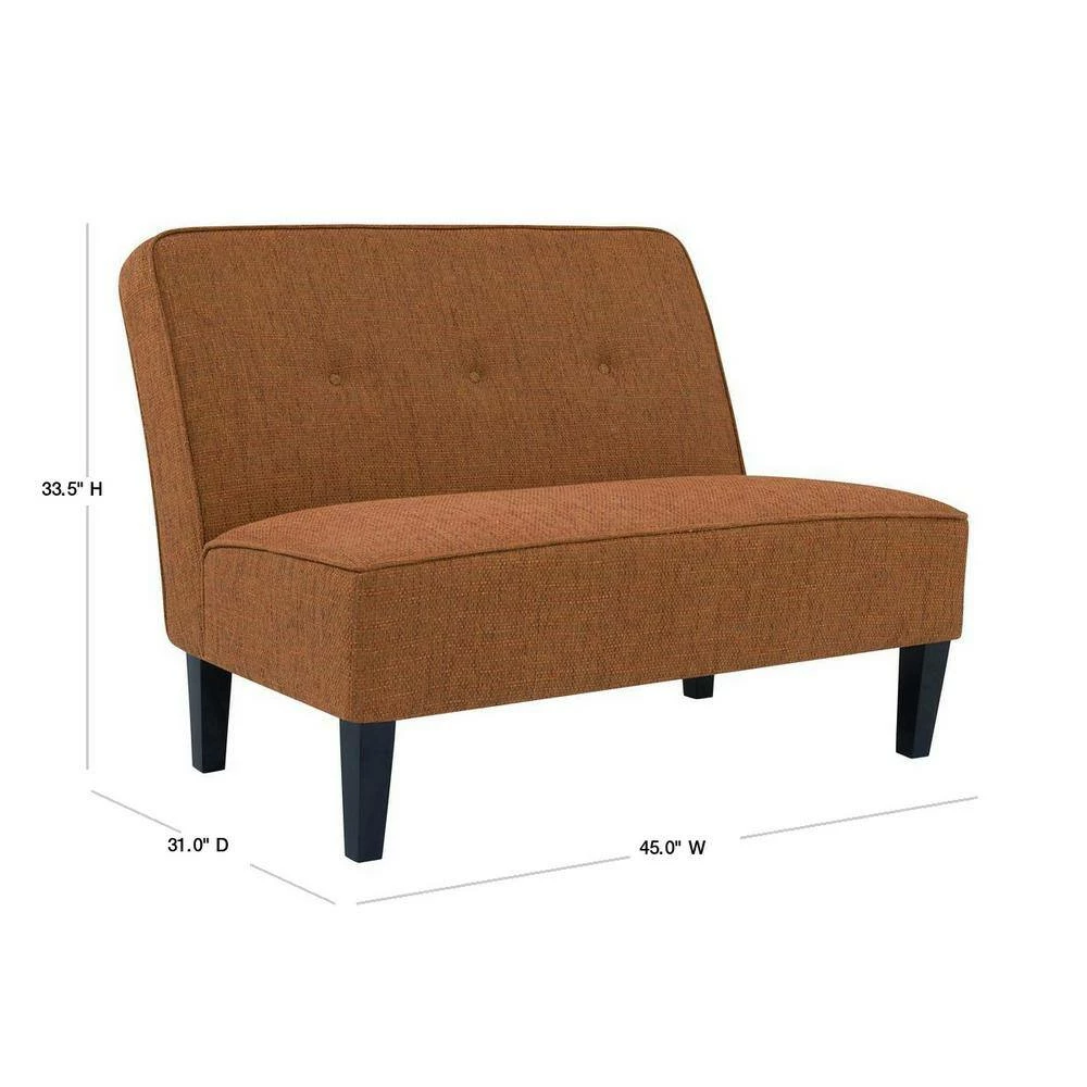 This button tufted settee features a transitional design with a curved square back that is highlighted by three buttons. Covered in a 100% polyester tweed fabric. Takes less than 15 minutes to assemble with included tool and instructions. Imported, color may vary.