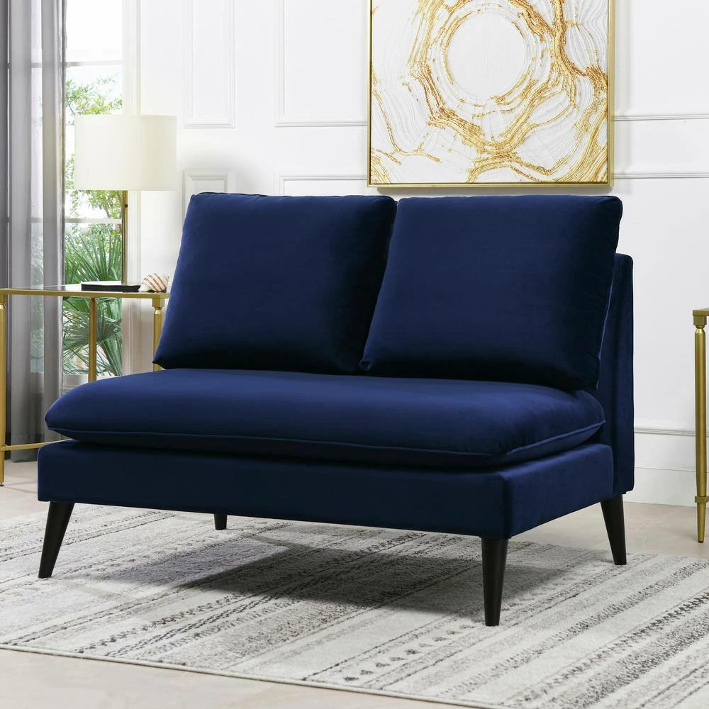 The Vera Settee by Jennifer Taylor Home is an adorable yet modern and sleek two-seater accent-piece perfect for adding much needed seating in any space. The 2-back cushions are removeable and zippered into place so they stay put while the seat cushion is attached. The slanted tapered solid wood legs are a nod to a retro, Mid-Century modern look. Create the ideal seating moment in your living room, bedroom, or entryway with the Vera armless settee.