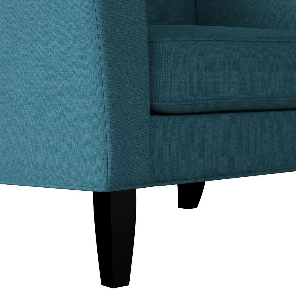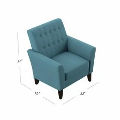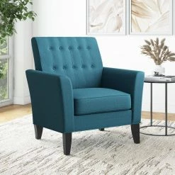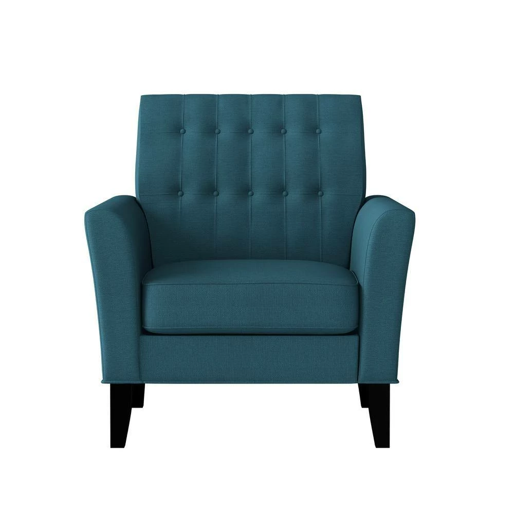 Offering an updated take on tradition, this modern armchair has great transitional style. Covered in a Linen-Like fabric made from 100% polyester, the chair features a square, button-tufted back and flared arms. Assembly required with included tool and instructions. Imported, color may vary.