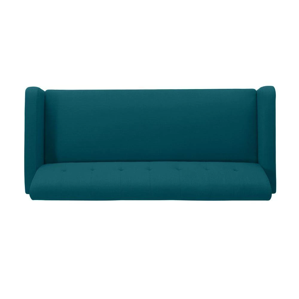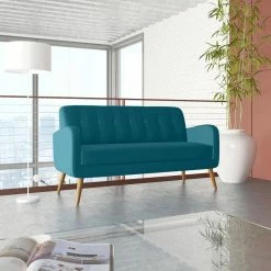 Sofa boasts a mid century modern design that will elevate your home. The sofa features a square back with lace tufted design, sinuous springs and a thick foam cushion for extraordinary comfort. Covered in a durable, easy clean 100% polyester linen-like fabric. HANDY LOCK easy connect, simply slide and click together in less than 15 minutes with included instructions. Ships in 1-box. Imported, color may vary.
