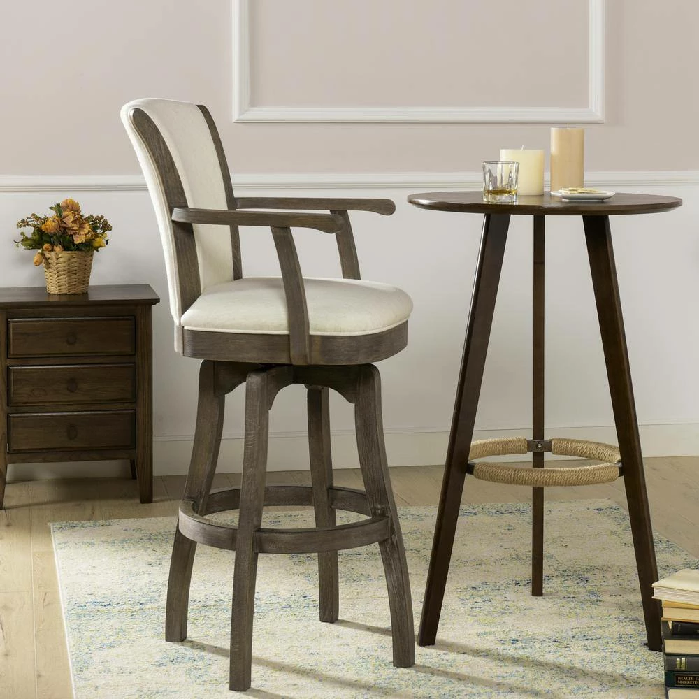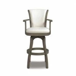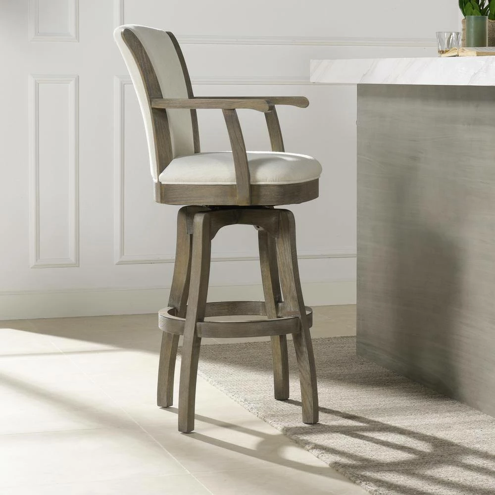 The Williams Swivel Bar Stool Collection puts a spin on that classic bar stool flair. Featuring a convenient 360-degree swivel seat complete with a plush upholstered backrest and wooden armrests, these oak bar stools capture that natural farmhouse vintage chic with a textured cool brown wood grain. Available in 30 bar and 26 counter seat heights, the Williams lets you wine and dine in comfort whether its at your in-home pub table or kitchen counter. A brass kickplate is included on the ringed footrest to preserve and protect the style of your stool. Due to the many variations in monitors and browsers, colors may appear different on different monitors. Since it is not possible to guarantee our online colors will look the same on all computers, we do not guarantee that what you see accurately portrays the color of the actual product. If it is important that the sample be exact, we highly recommended that you order a swatch sample first, before placing the order.