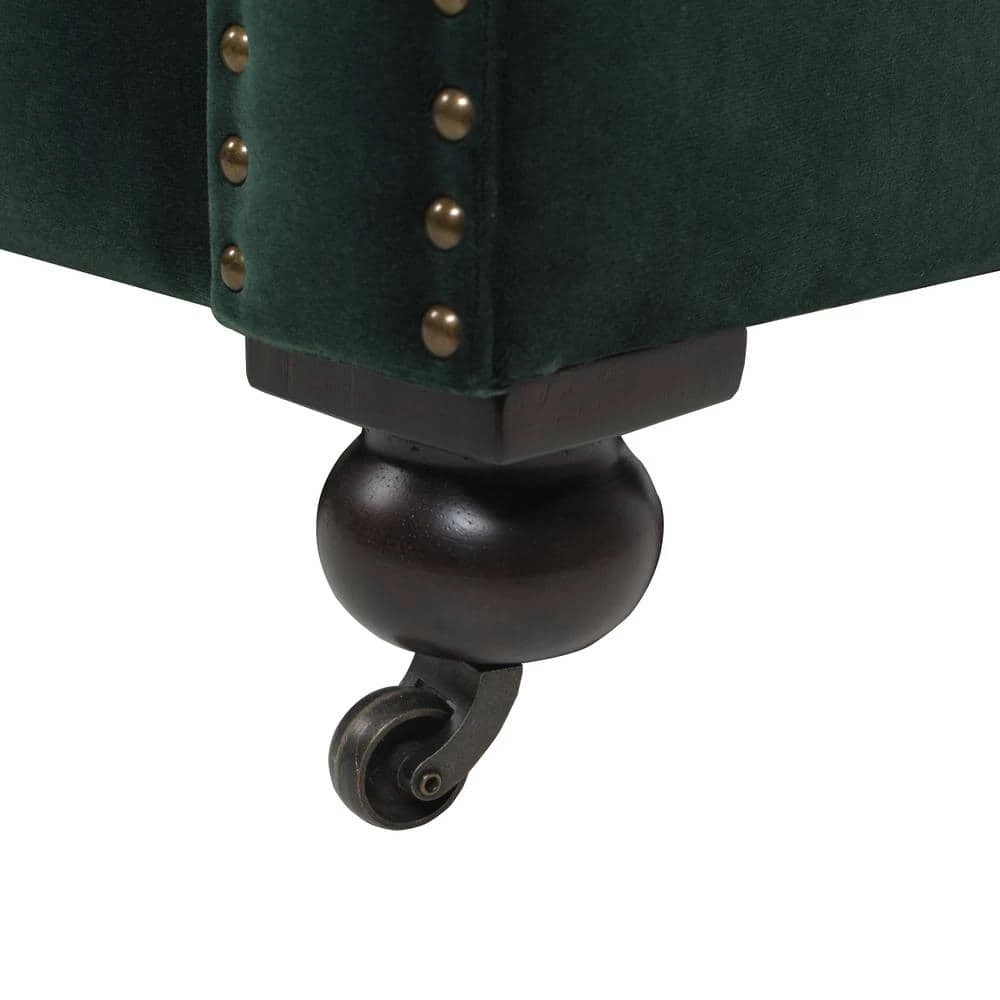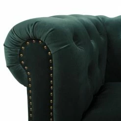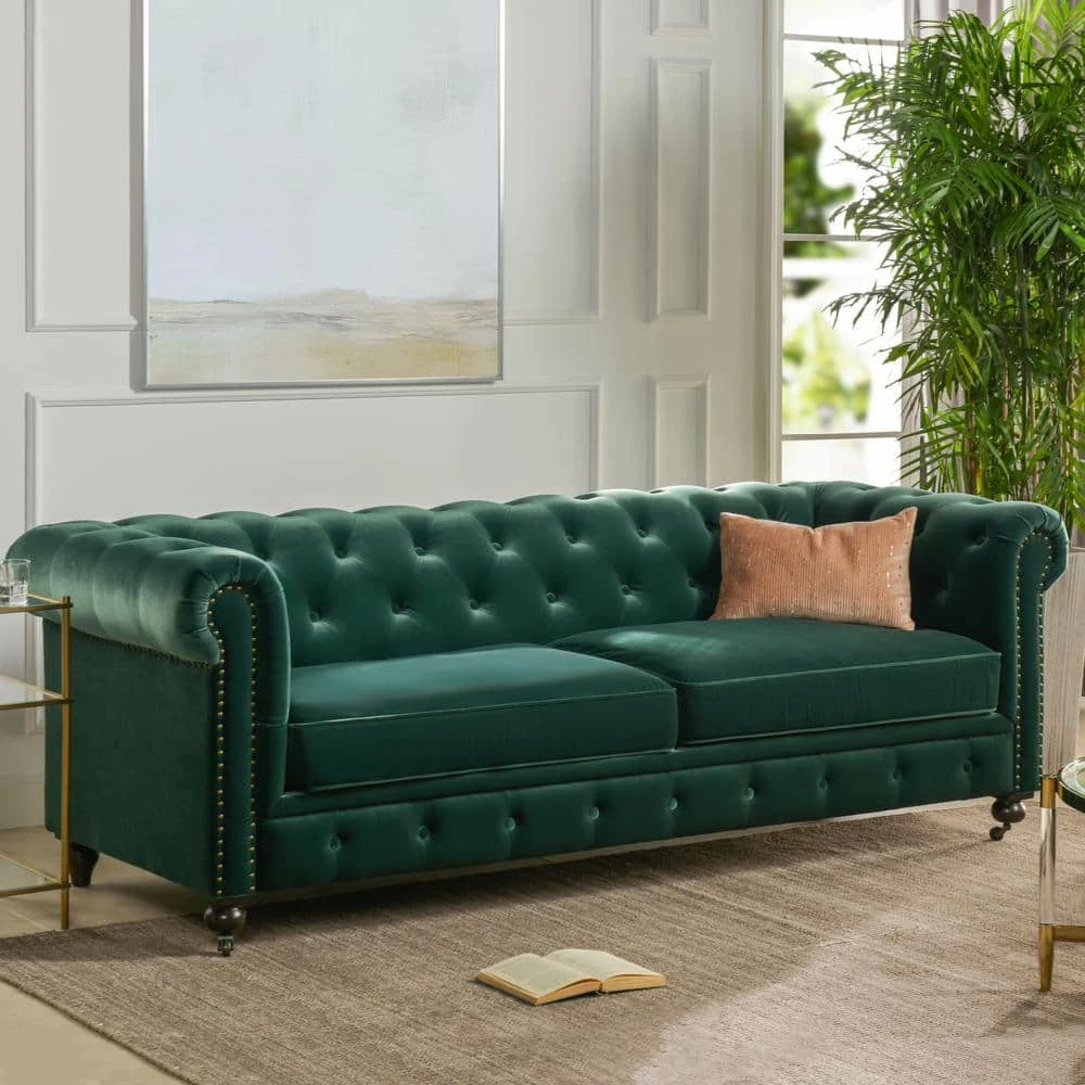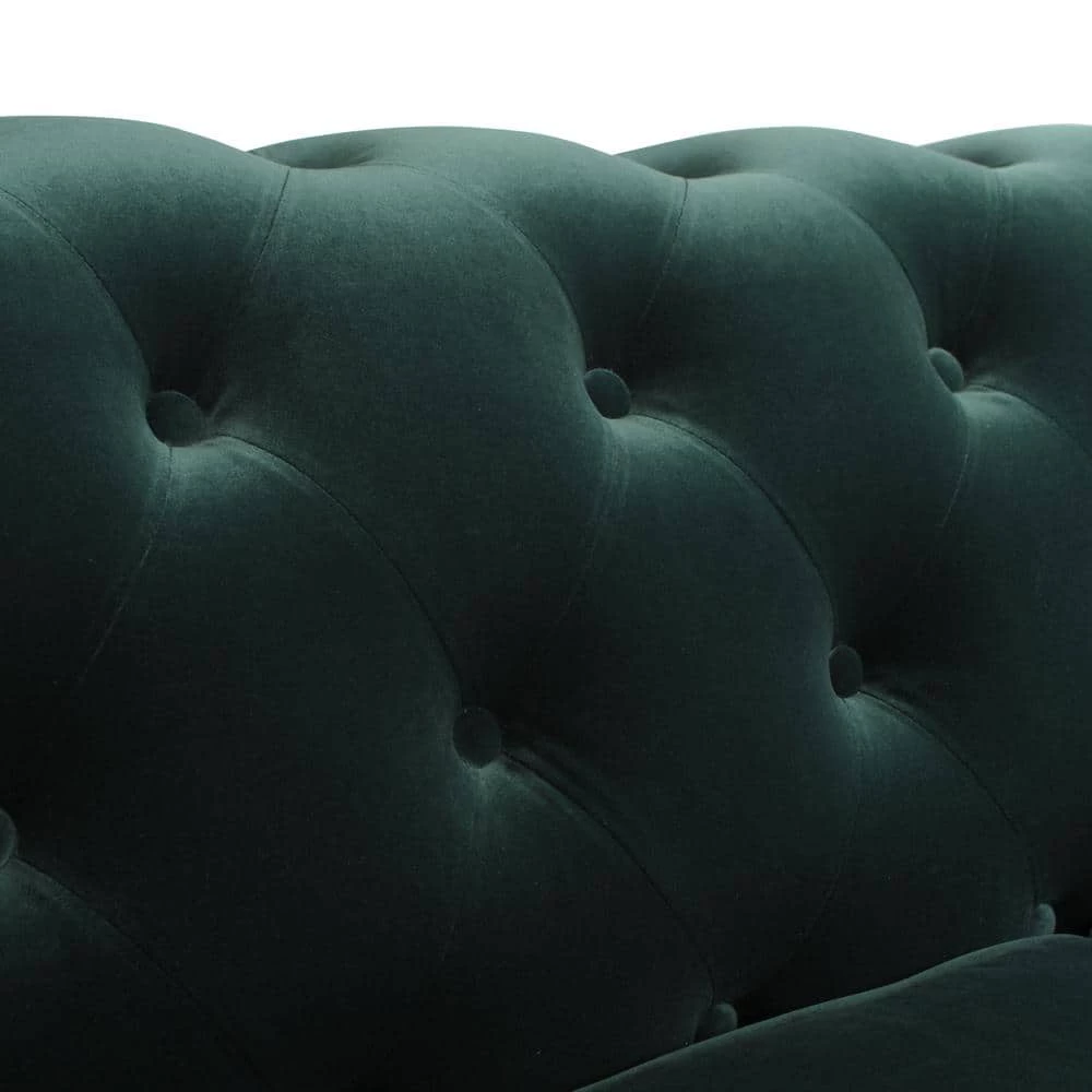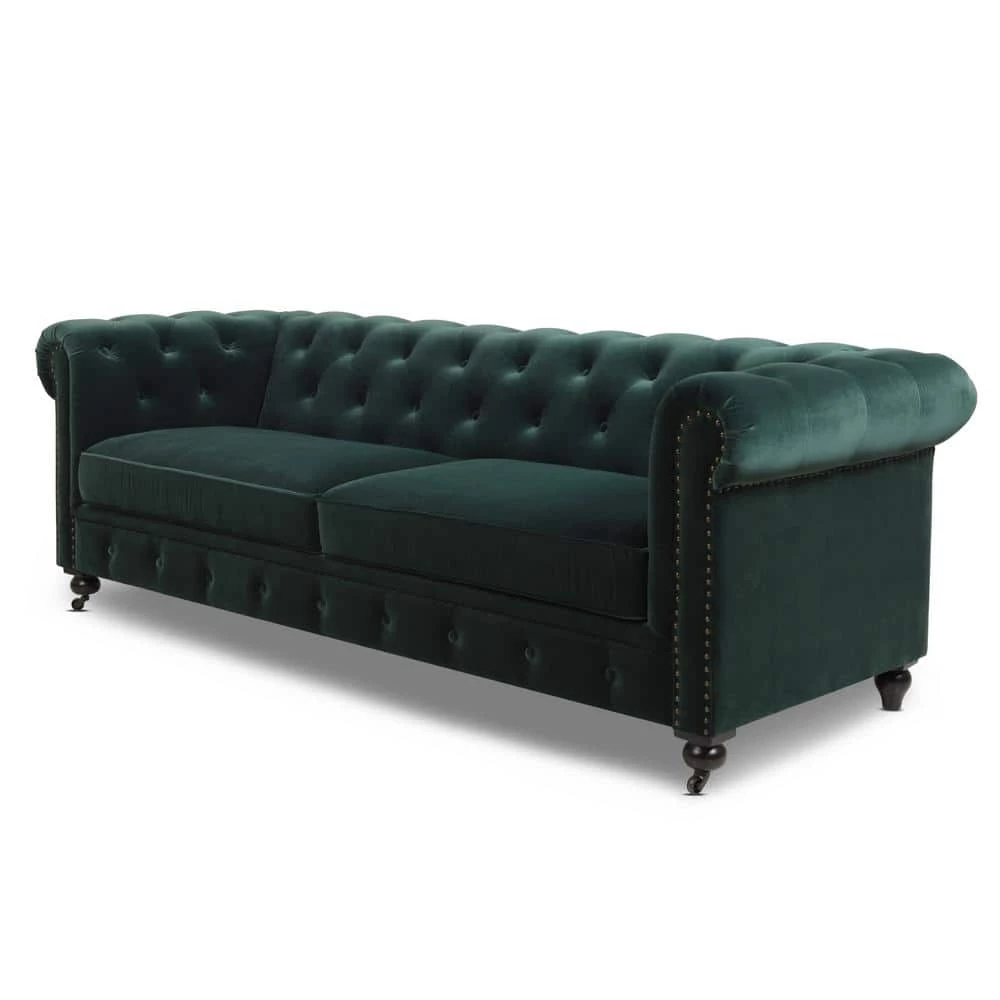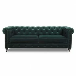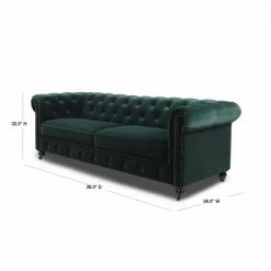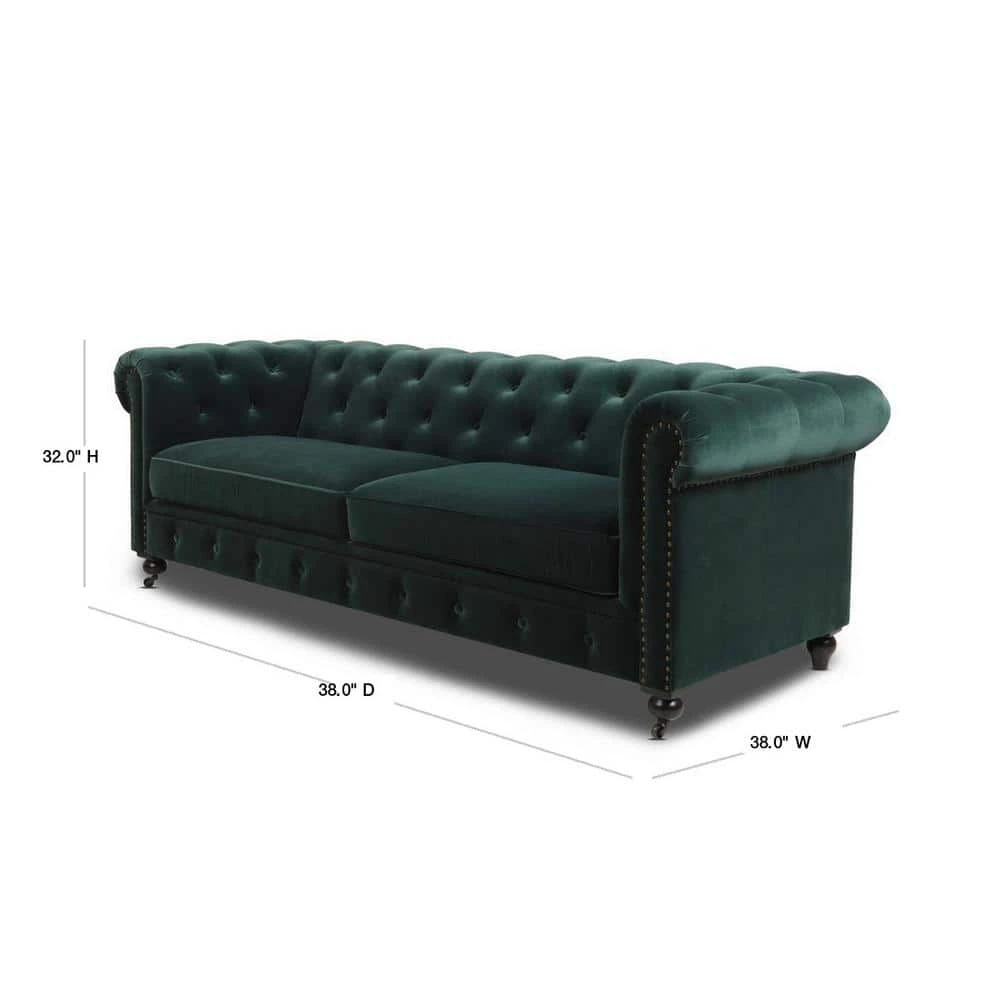 Stylishly impeccable, the Winston Chesterfield Sofa Collection by Jennifer Taylor Home provides the finest luxury seating for your home. Richly upholstered in velvet, this lush sofa evokes the classic Chesterfield design with hand-applied button tufting, smooth curled arms, a spacious seating for 3, dark espresso legs, and studded antique brass nailheads. The Winston possesses a sophisticated vintage chic that never goes out of style and is sure to remain a centerpiece in your living room, guestroom, or parlor for years to come. Two convenient casters are included on the front legs for ease of relocation. To bring the whole room together, the Winston is also available a single armchair variation.